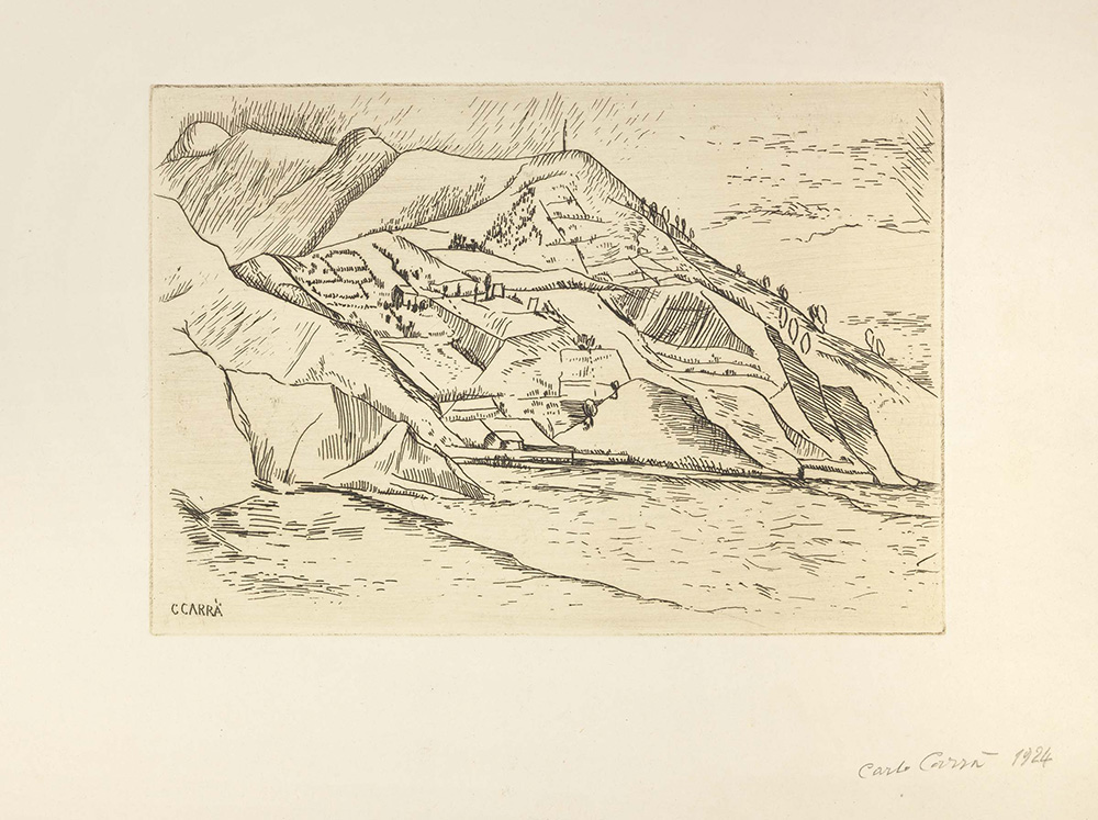 Carlo Carrà Quargnento (Al) 1881 - Milano 1966 Il golfo (Paesaggio), 1924 Acquaforte su rame, cm. 14,8x21,5 (lastra), cm. 24,8x36 (carta) Firma in lastra in basso a sinistra: C. Carrà, firma e data a matita sul margine in basso a destra: Carlo Carrà 1924; al verso: timbro Galleria del Milione, Milano, con n. 2198/2. Tiratura di 25 esemplari nel 1924, oltre a due o tre esemplari di prova, e 10 esemplari fuori commercio nel 1951.