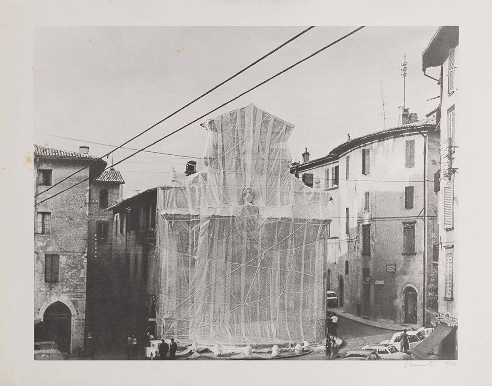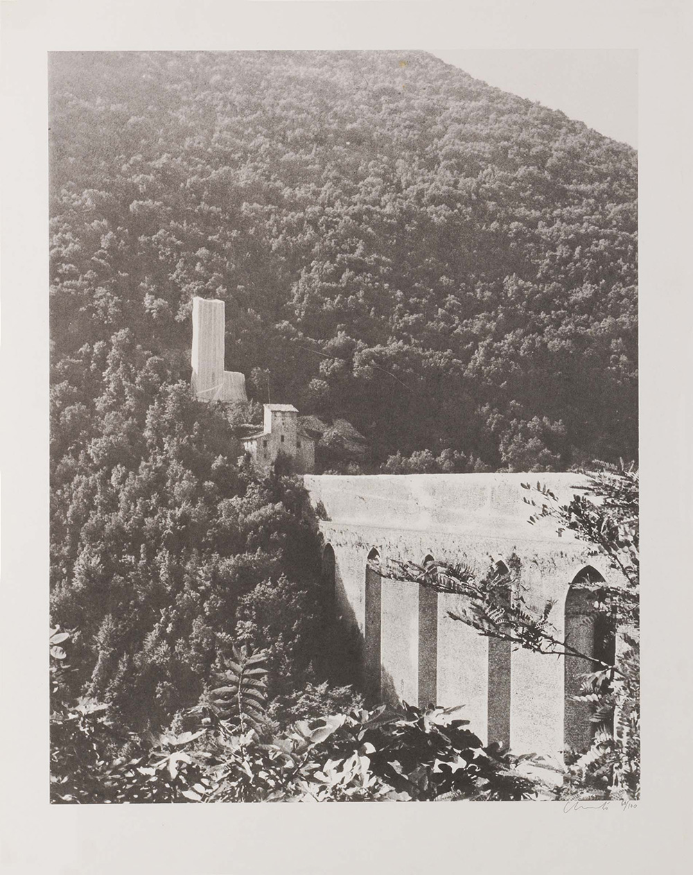 Christo (Christo Javacheff) Gabrovo 1935 Due grafiche da «Packet Fountain and Packet Tower, Spoleto, 1968» Serigrafia, es. 60/100, cm. 65x82,5 ognuna (carta) Entrambe con firma e tiratura sul margine in basso a destra: Christo 60/100.
