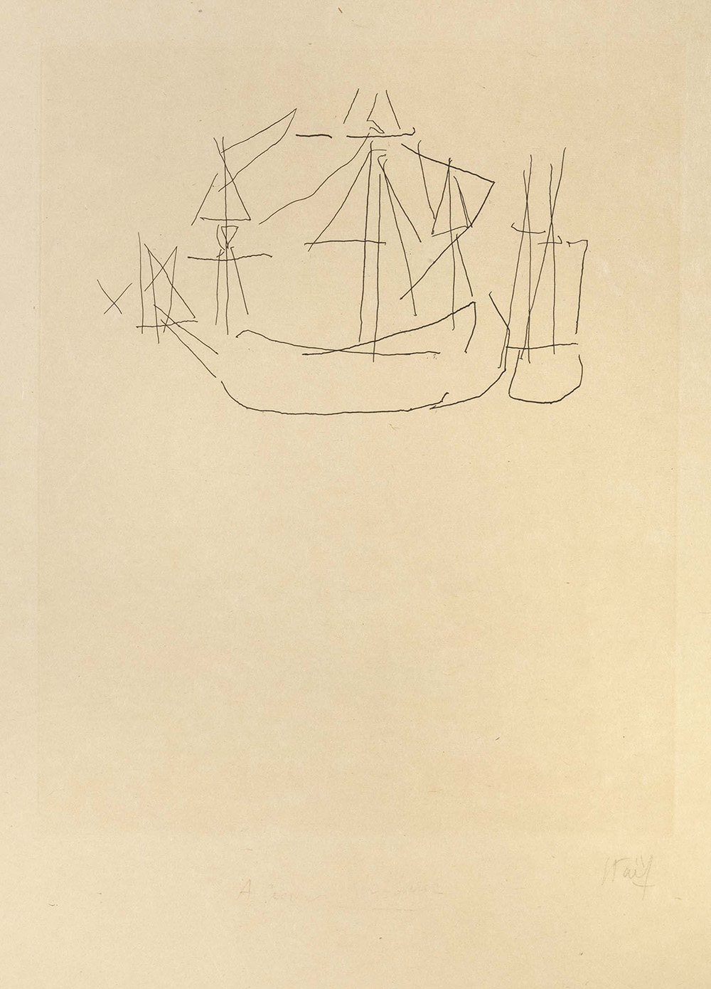 Nicolas De Staël San Pietroburgo 1914 - Antibes 1955 Tombeau d'Hercules Seghers: Bateaux II, (1954) Acquaforte, cm. 34,5x27,5 (lastra), cm. 52x36,2 (carta) Firma a matita sul margine in basso a destra: Staël, dedica parzialmente cancellata al centro: A [...], timbro a secco in basso a destra: Libreria Prandi Reggio E. Tiratura di 25 esemplari firmati, datati e giustificati, qualche prova d'artista e qualche prova su carta Giappone di cui una firmata e dedicata a Johnny Friedlaender, due prove tirate nel 1962. Bibliografia: Nicolas de Staël. Catalogue raisonné des oeuvres sur papier, établi par Françoise de Staël, Ides et Calendes, Losanna, 2013, p. 522, n. 1372 (52).