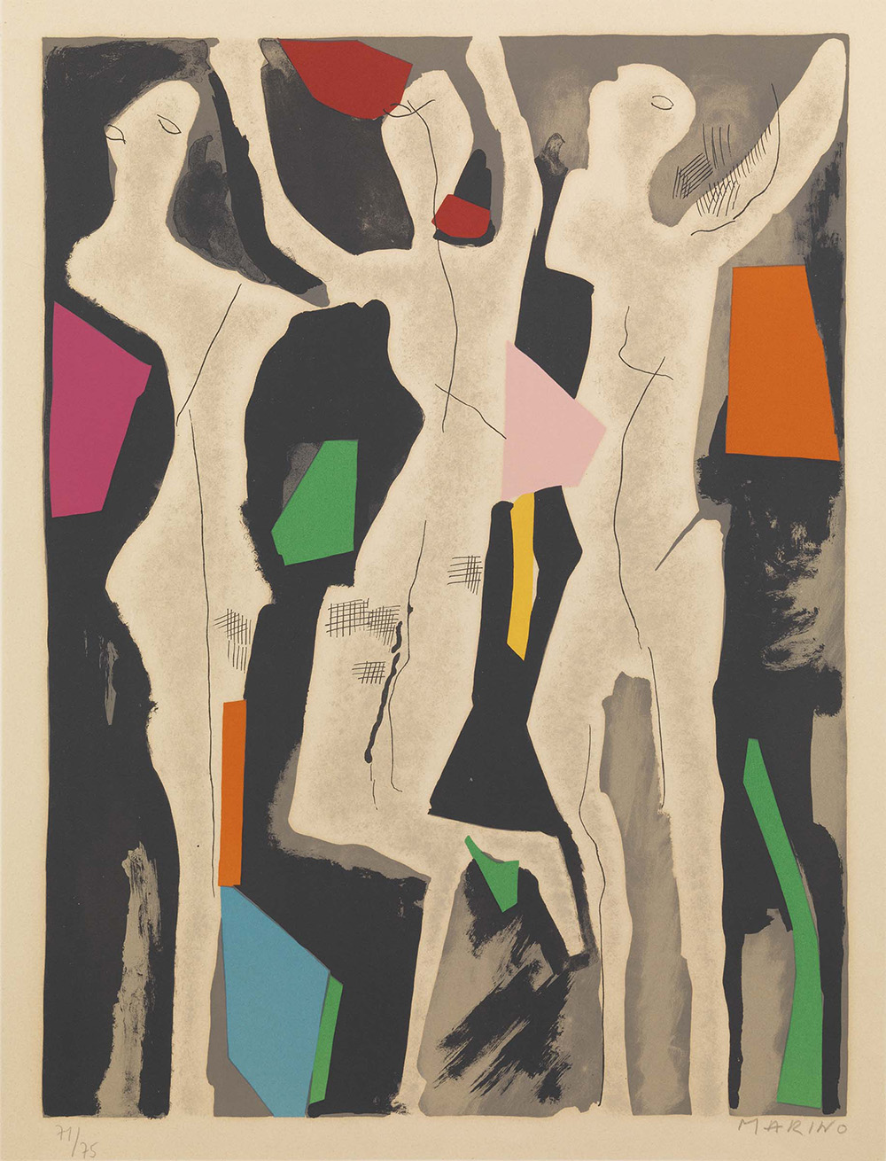 Marino Marini Pistoia 1901 - Viareggio (Lu) 1980 Personnages du sacre du printemps V, 1974 Litografia a colori, es. 71/75, cm. 52,39,3 (lastra), cm. 64,6x50 (carta) Firma a matita sul margine in basso a destra: Marino, tiratura in basso a sinistra: 71/75. Dall'album Personnages du sacre du printemps, tiratura di 3 esemplari nominativi, 10 in numeri romani, 75 in numeri arabi e 25 esemplari fuori commercio numerati da XI/XXXV a XXV/XXXV, stampatore Mourlot, Parigi, editori Societé International d'Art XX Siècle, Parigi e Leon Amiel, New York. Bibliografia: Guido Guastalla, Giorgio Guastalla, Marino Marini. Catalogo ragionato dell'Opera grafica (Incisioni e Litografie) 1919-1980, Edizioni Graphis Arte, Livorno, 1990, pp. 175, 244, 257, 258, n. L118.