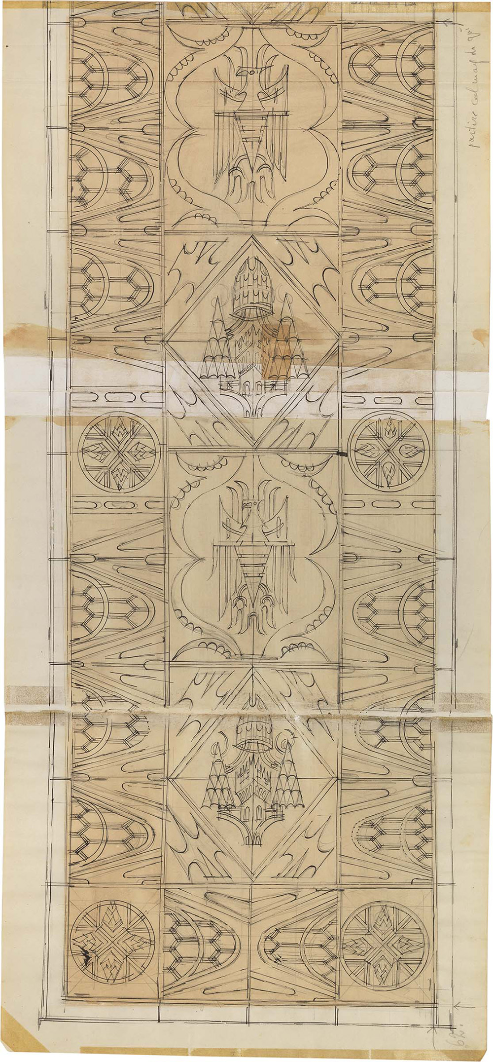 Fortunato Depero Fondo, Val di Non (Tn) 1892 - Rovereto (Tn) 1960 Studio per intarsio di porta, (1955) China su carta, cm. 65,3x29,7 Firma al verso: Fortunato Depero. Al verso sulla cornice: etichetta Galleria Fonte d'Abisso, Modena, con dati dell'opera.
