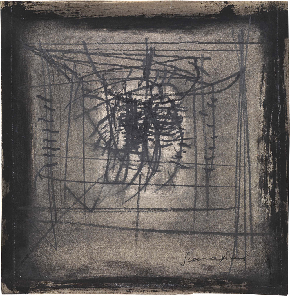 Emilio Scanavino Genova 1922 - Milano 1986 Senza titolo (Sindone), 1958 Tecnica mista su cartoncino, cm. 32,7x31,7 Firma in basso a destra: Scanavino; firma e titolo al verso, su un cartone di supporto: Scanavino / "Sindone". Storia: Galleria Valente, Finale Ligure; Collezione privata Certificato su foto di Giorgina Scanavino, 28-10-88. Bibliografia: Carlo Pirovano, Giorgina Graglia Scanavino, Scanavino. Catalogo generale volume primo, Electa, Milano, 2000, p. 138, n. 1958 59.