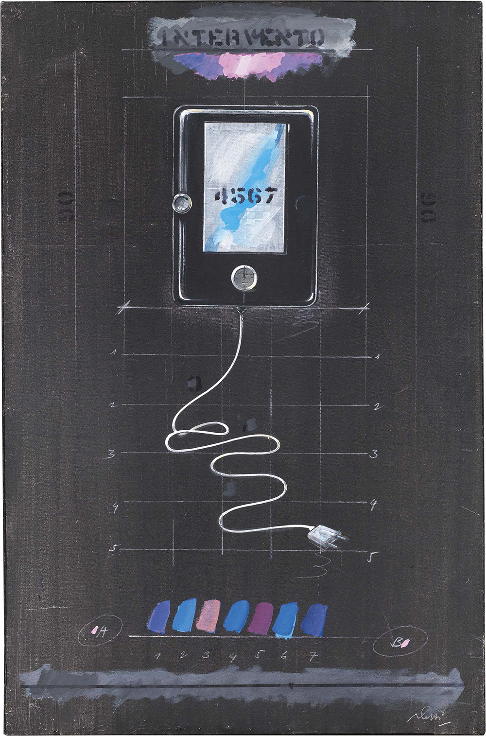 Fabrizio Plessi Reggio Emilia 1940 Intervento, anni Settanta Olio su tela, cm. 91,8x59,3 Firma in basso a destra: Plessi. Certificato Directionarts, Trento, con n. 738-49.