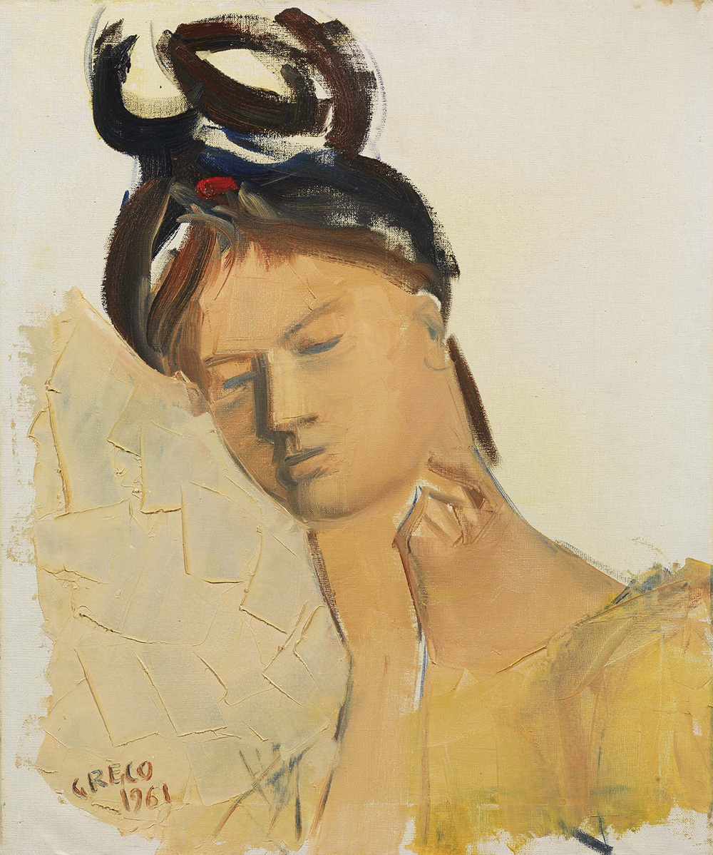 Emilio Greco Catania 1913 - Roma 1995 Testa di giovane donna, 1961 Olio su tela, cm. 60x50 Firma e data in basso a sinistra: Greco / 1961. Al verso sul telaio: etichetta Collection Mr. e Mrs. Max Stern / Dominion Gallery / Montreal, con n. Gre 1i. Certificato su foto Archivio Emilio Greco, Roma, 19-05-04.