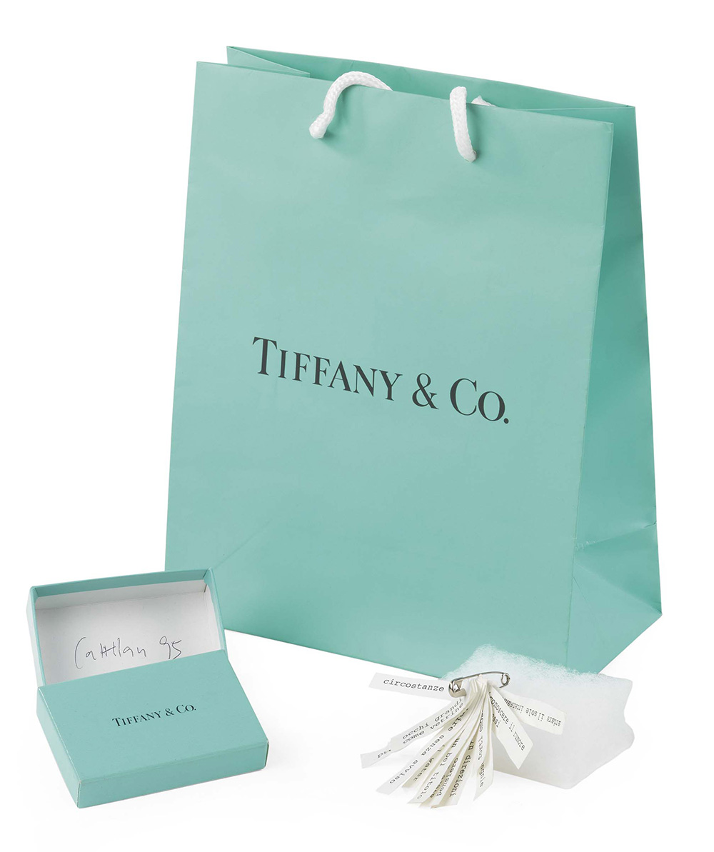 Maurizio Cattelan Padova 1960 Senza titolo, 1995 Busta di carta, portagioie e foglietti scritti a macchina, spilla da balia, in teca di plexiglass, esemplare unico, cm. 8,5x32x24 (teca) Firma e data dentro il portagioie: Cattelan 95. Storia: Collezione Nelsy Leidi; Collezione privata Certificato di provenienza di Nelsy Leidi, Milano, 6 marzo 2001. Temporanea importazione con IVA del 10% per acquirenti italiani.