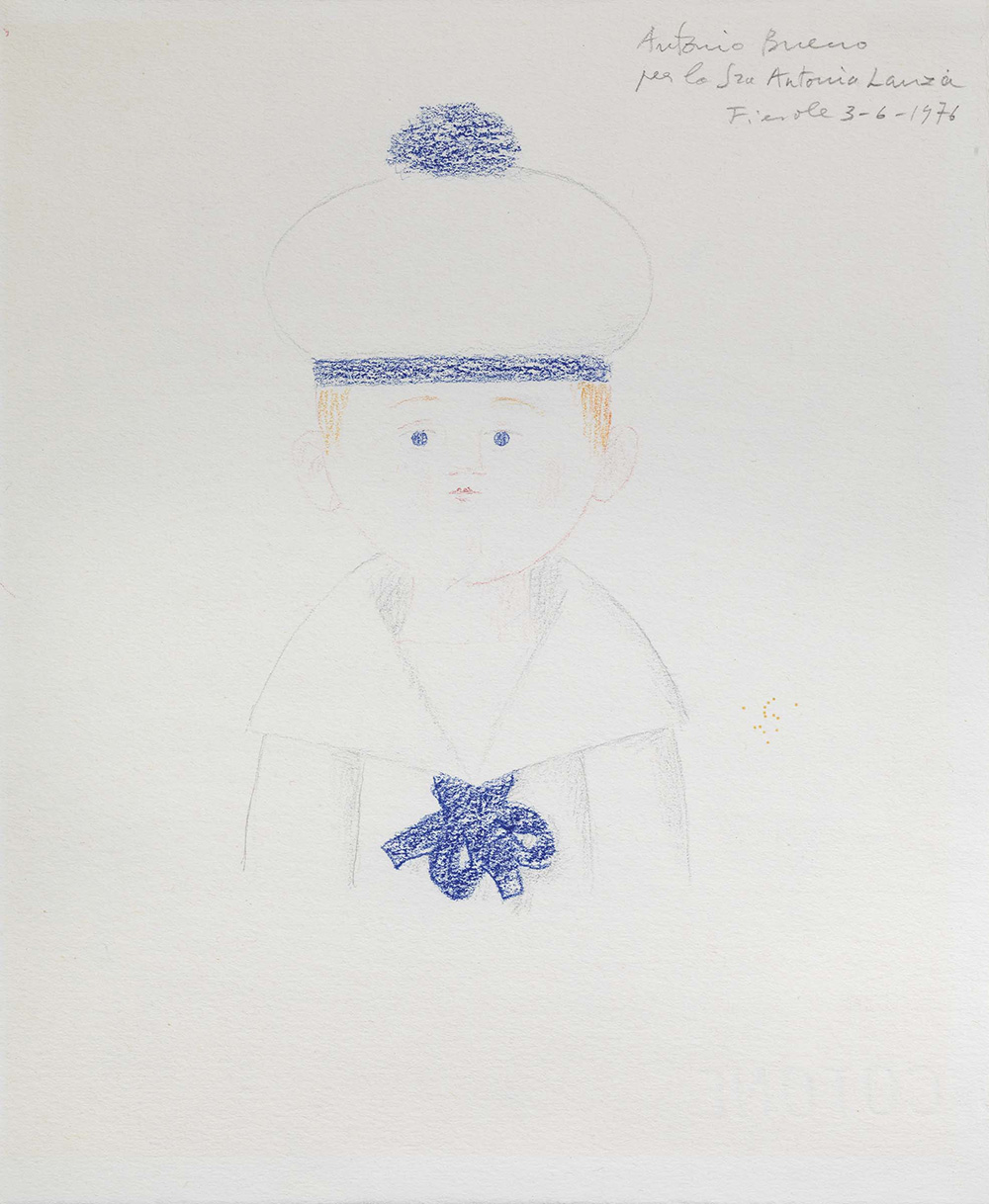 Antonio Bueno Berlino 1918 - Fiesole (Fi) 1984 Marinaretto, 1976 Matita e pastelli su carta, cm. 24x19,5 Firma, dedica e data in alto a destra: Antonio Bueno / per la Sra Antonia Lanza / Fiesole 3-6-1976. Certificato su foto Archivio Antonio Bueno, con n. 840 G/I.
