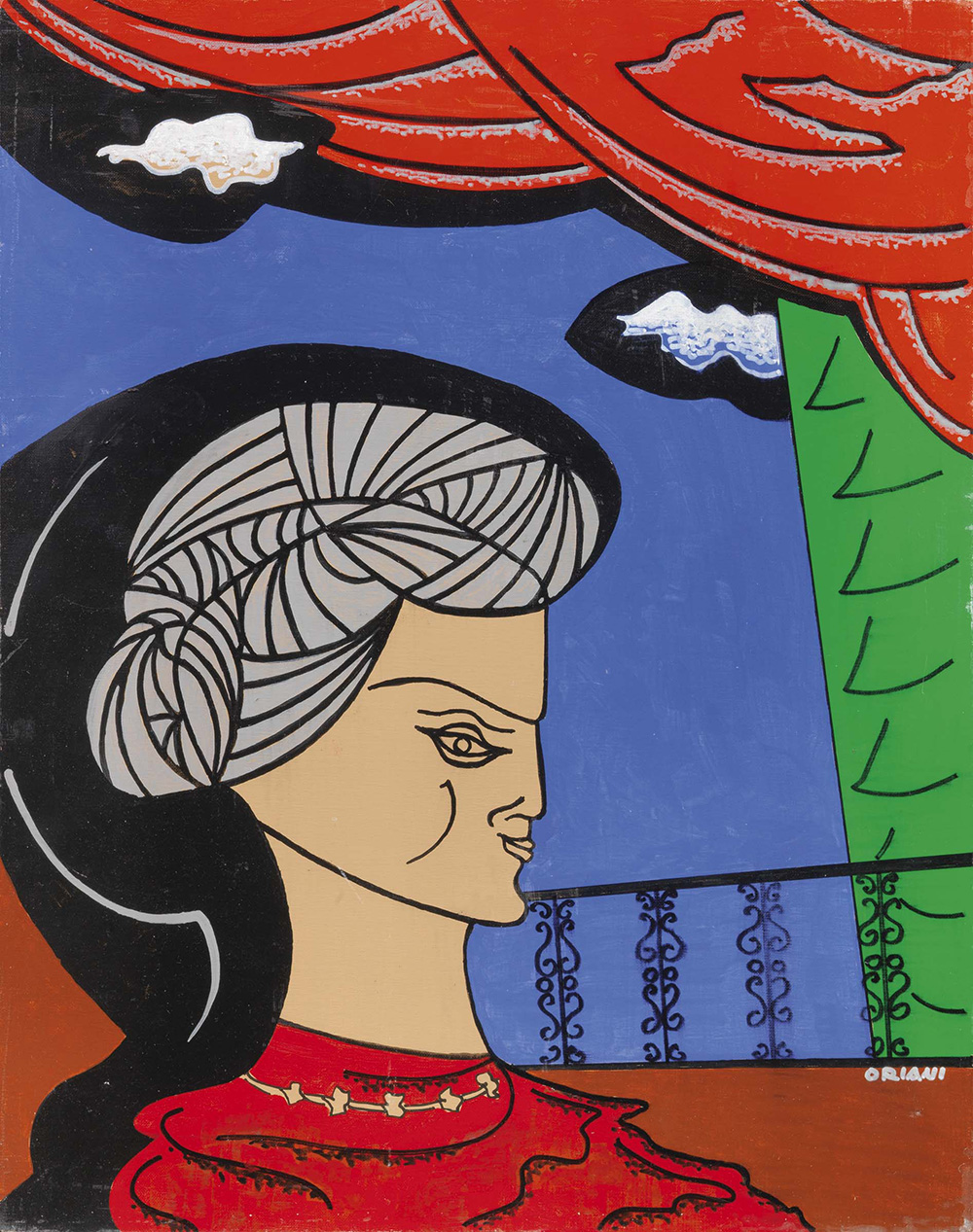 Pippo Oriani Torino 1909 - Roma 1972 La signora, 1965-70 Olio su tela applicata su pannello, cm. 50x40 Firma in basso a destra: Oriani. Al verso: etichetta con dati dell'opera e n. dep. MZN DP9. Certificato su foto Fondation Pippo Oriani, Jussy, 4 luglio 2005, con n. Rep. provv. FPO/MU 681. Bibliografia: Giovanni Lista, Mariastella Margozzi, Catalogo generale delle opere di Oriani, primo volume, Editoriale Giorgio Mondadori, Milano, 2009, p. 318.