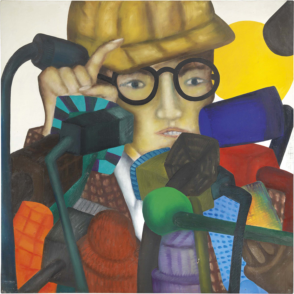 Marco Cingolani Como 1961 Conferenza stampa, 1991 Olio su tela, cm. 100x100 Firma, data e titolo al verso sulla tela: Marco Cingolani 1991 / "Conferenza stampa".