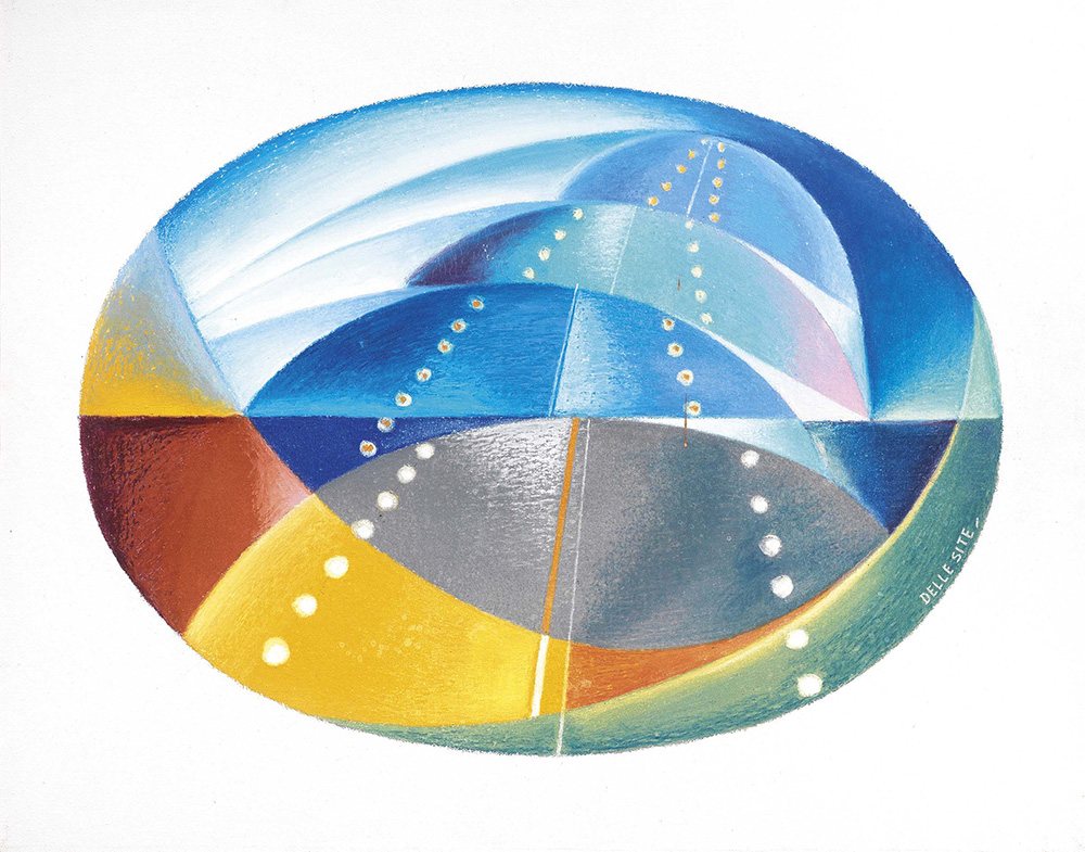 Mino Delle Site Lecce 1914 - Roma 1996 Forma - Senso atterraggio, 1976 Olio su tela, cm. 53x66,5 Firma in basso a destra: Delle Site. Al verso sul telaio: timbro Archivio Mino Delle Site, Roma: n. C.585. Certificato su foto Archivio Mino Delle Site, Roma, 28/03/03, con n. C.585. Bibliografia: Terzo Occhio, n. 106, marzo 2003, Edizioni Bora, Bologna, p. 23.