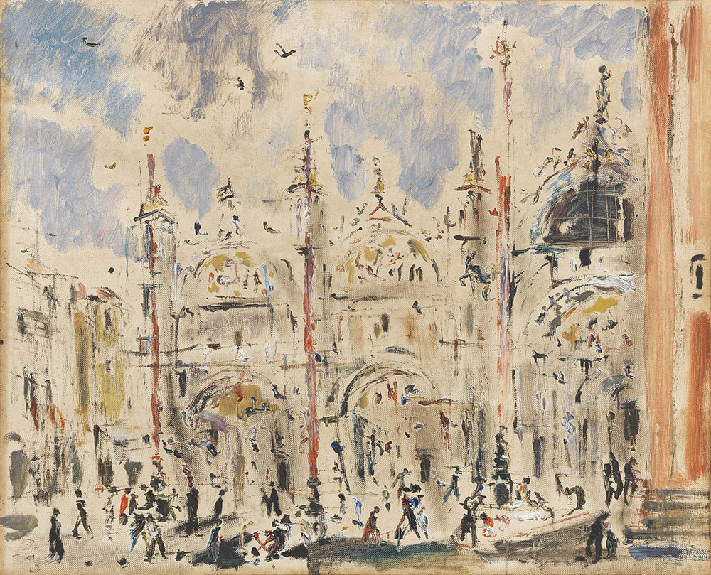 Filippo de Pisis Ferrara 1896 - Milano 1956 Venezia - San Marco, 1947 Olio su tela, cm. 49x61 Scritta, firma e data al verso sulla tela: Omaggio a Guardi / [...] / Pisis 47 / S.B. Storia Collezione Geiger, Venezia; Collezione privata Certificato su foto Associazione per il Patrocinio dell'Opera di Filippo de Pisis, Milano, 24 gennaio 1995, con n. 00286. Bibliografia Giuliano Briganti, De Pisis. Catalogo generale, tomo secondo, opere 1939-1953, con la collaborazione di D. De Angelis, Electa, Milano, 1991, p. 715, n. 1947 49.