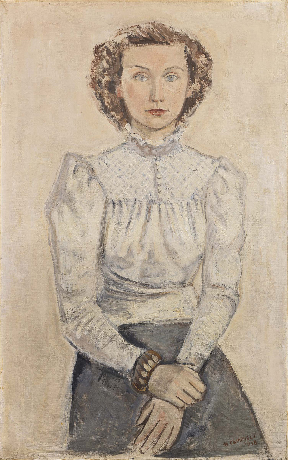 Massimo Campigli Berlino 1895 - St.Tropez 1971 Ritratto di Suzanne Hangrane, 1938 Olio su tela, cm. 116,5x73,5 Firma e data in basso a destra: M Campigli 1938. Al verso sulla cornice: cartiglio Wilhelm Knöll, Zurich. Storia Collezione Suzanne Hangrane, Svizzera; Collezione C.B., Parigi; Collezione E.L., Borga Montero; Collezione privata Certificato su foto di Nicola Campigli, Saint Tropez 27/01/2007, con n. 541261114. Esposizioni Attraverso il Novecento. Mino Rosi: l'artista e la collezione da Fattori a Morandi, Volterra, Palazzo dei Priori, 18 giugno - 9 ottobre 2011, cat. p. 71, illustrato a colori. Bibliografia Marco Fagioli, Passages nell'arte del Novecento. Da Degas a Dubuffet, Aión, Firenze, 2009, p. 186; Nicola Campigli, Eva Weiss, Marcus Weiss, Campigli, catalogue raisonné, vol. II, Silvana Editoriale, Milano, 2013, p. 492, n. 38-005.