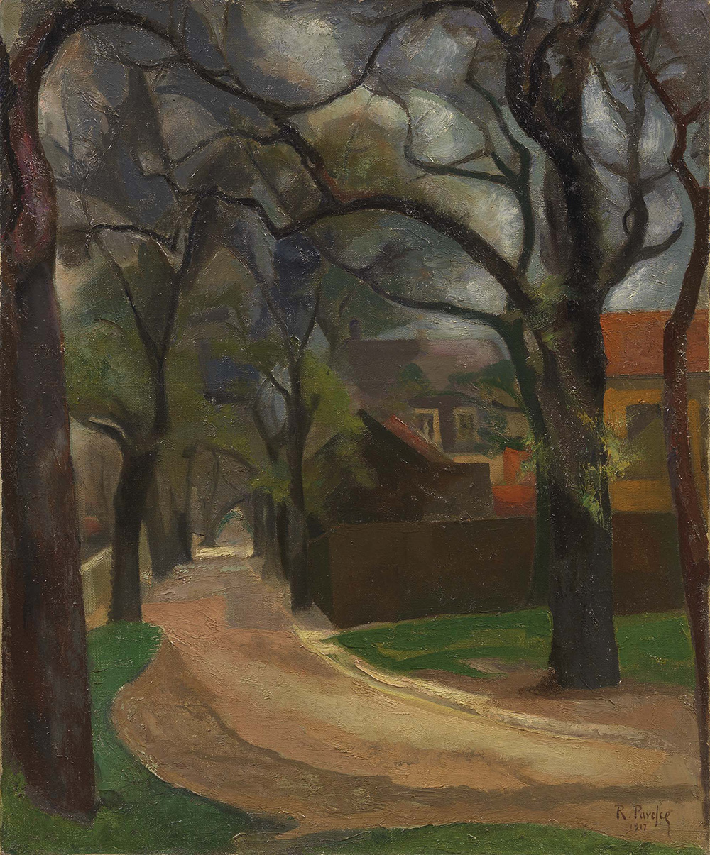 René Paresce Carouge 1886 - Parigi 1937 Paesaggio (Paysage), 1917 Olio su tela, cm. 65x54 Firma e data in basso a destra: R. Paresce / 1917. Al verso sul telaio scritta a matita: "La Mayson Lacroyf a [...]: etichetta parzialmente abrasa Galerie Vildrac, Paris, con n. 991: etichetta parzialmente abrasa con n. 16. Opera registrata presso l'Archivio Paresce, a cura di Rachele Ferrario, al n. 5/17. Bibliografia Rachele Ferrario, René Paresce. Catalogo ragionato delle opere, Skira editore, Milano, 2012, pp. 64, 158, n. 5/17.