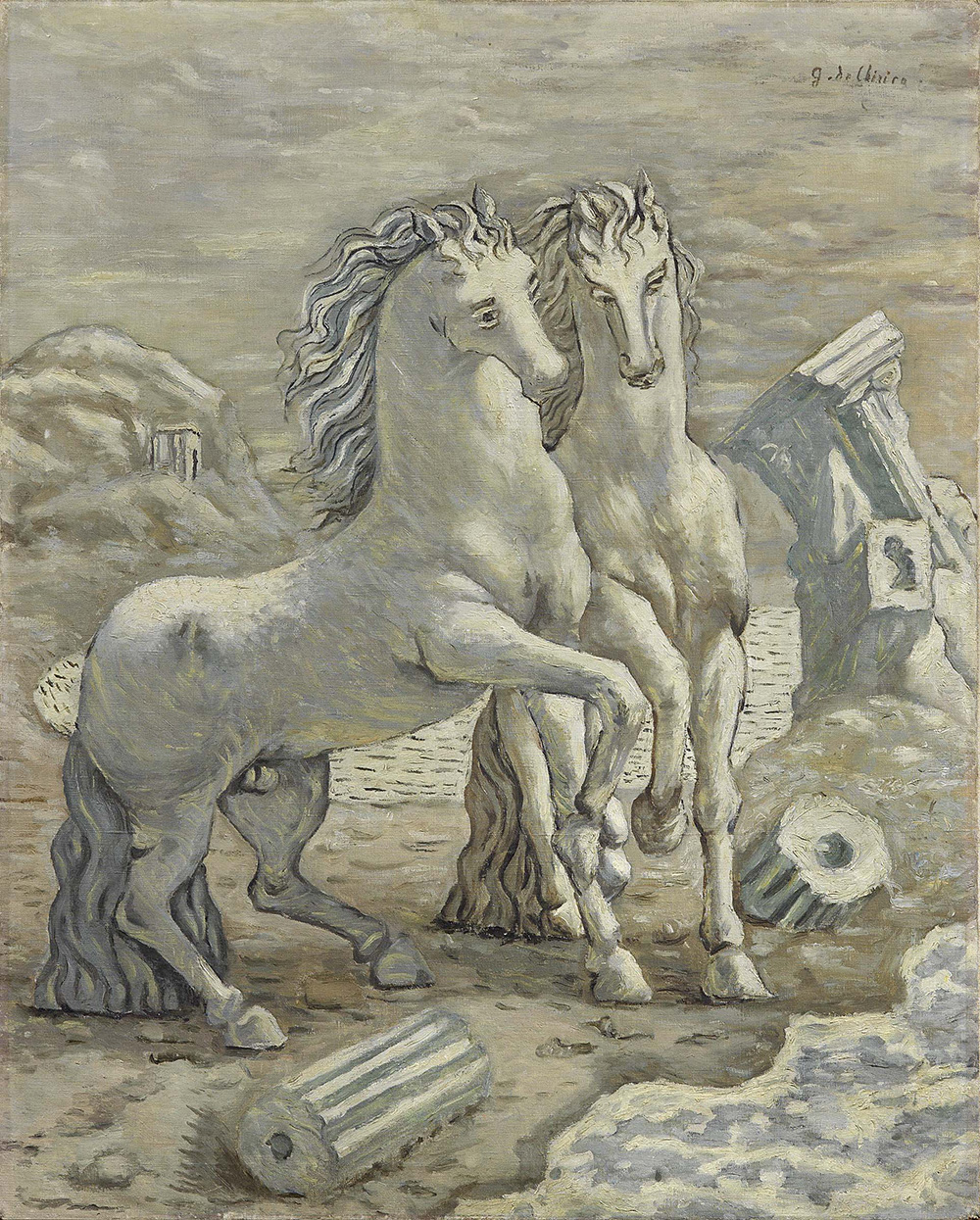Giorgio de Chirico Volos 1888 - Roma 1978 Cavalli e rovine in riva al mare, 1927 Olio su tela, cm. 91,7x73,7 Firma in alto a destra: G. de Chirico. Al verso sul telaio: etichetta Kunstsammlungen NRW, Düsseldorf / Die Andere Moderne / De Chirico/Savinio (4082) / 15. September - 2. Dezember 2001, Kat. Nr. 126: etichetta "La bella pittura 1900 - 1945" / Pinacoteca provinciale di Potenza / ottobre 2003 - gennaio 2004 / Cat. pp. 84-85: etichetta Fondazione della Camera dei Deputati / "Montecitorio e la bella pittura 1900-1945" / Roma, Palazzo Montecitorio, Sala della Regina / Cat. pp. 70-71; sulla cornice: scritta P.G. 680. Storia Collezione Paul Guillaume, Parigi; Collezione Albert C. Barnes, Philadelphia; Collezione Alan Neville; Collezione privata, Stati Uniti; Collezione privata Certificato su foto di Paolo Baldacci, Milano, 3 settembre 1997, perizia n. 3/97; dossier storico-artistico di Maurizio Fagiolo dell'Arco, novembre 1997; certificato su foto Fondazione Giorgio e Isa de Chirico, Roma, 24 marzo 2003, con n. 0017/03/03/OT. Esposizioni Die Andere Moderne, De Chirico / Savinio, Düsseldorf, Kunstsammlung Nordrhein-Westfalen, 15 settembre - 2 dicembre 2001, poi Monaco, Lenbachhaus, 20 dicembre 2001 - 10 maggio 2002, cat. p. 318, n. 126, illustrato a colori; La bella pittura 1900-1945, Potenza, Pinacoteca Provinciale, 10 ottobre 2003 - 19 gennaio 2004, cat. pp. 84, 85, 189, illustrato a colori; Montecitorio e la bella pittura 1900-1945, Roma, Palazzo Montecitorio, Sala della Regina, 2 marzo - 9 aprile 2004, cat. pp. 70, 71, illustrato a colori; La natura secondo de Chirico, a cura di Achille Bonito Oliva, Roma, Palazzo delle Esposizioni, 9 aprile - 11 luglio 2010, cat. p. 75, n. 14, illustrato a colori; Giorgio de Chirico. Le Voyant, Firenze, Galleria d'Arte Frediano Farsetti e Palazzo Corsini, 29a Biennale Internazionale dell'Antiquariato, 25 settembre - 4 ottobre 2015, cat. pp. 30, 31, n. 4, illustrato a colori; Giorgio de Chirico. The Enigma of the World, Istanbul, Pera Museum, 23 febbraio - 1 maggio 2016, cat. p. 171, illustrato a colori. Attestato di libera circolazione.
