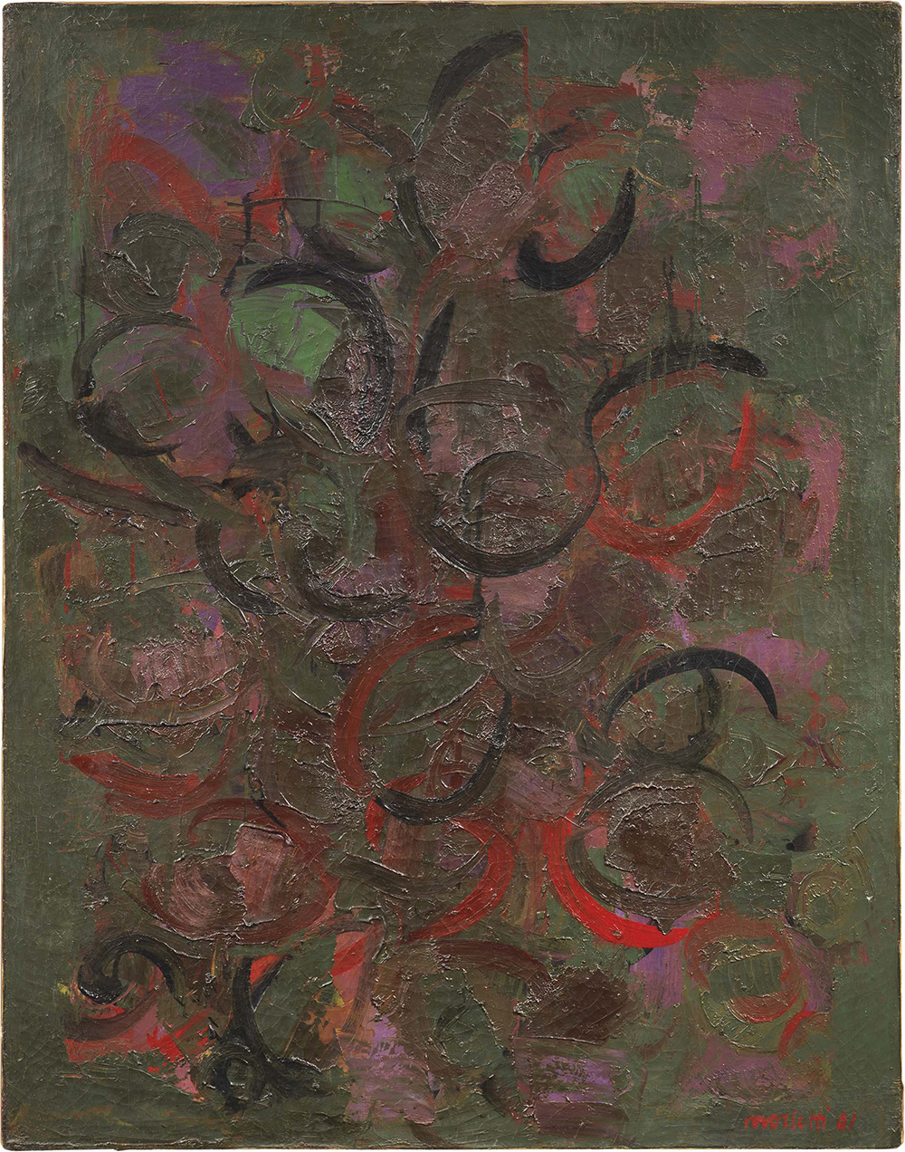 Ennio Morlotti Lecco 1910 - Milano 1992 Paesaggio (Vegetazione), 1961 Olio su tela, cm. 130x100 Firma e data in basso a destra e al verso sulla tela: Morlotti 61; titolo sul telaio: Vegetazione: timbro Galleria Blu, Milano. Foto autenticata dall'artista in data 7/5/85 e in data 23/6/89. Esposizioni Da Boldini a Pollock. Pittura e scultura del XX secolo, Torino, nell'ambito delle manifestazioni Italia '61, cat. p. 145; Bruno Cassinari, Renato Guttuso, Ennio Morlotti, Milano, Galleria Medea, 10 maggio - 3 giugno 1973, cat. p. 23. Bibliografia Giuseppe Marchiori, XX Siècle, XXIV, n. 19, 1962, p. 118; Gianfranco Bruno, Pier Giovanni Castagnoli, Donatella Biasin, Ennio Morlotti. Catalogo ragionato dei dipinti, tomo primo, Skira editore, Milano, 2000, p. 271, n. 626.