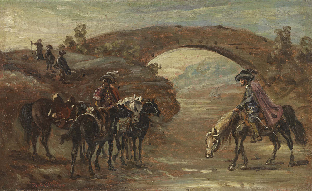 Giorgio de Chirico Volos 1888 - Roma 1978 Cavalieri al guado, 1943 Olio su tela, cm. 28,5x46,5 Firma in basso a sinistra: G. de Chirico. Al verso sulla tela: etichetta Galleria del Milione, Milano, con indicazione Perizia Bruni n. 51/78. Storia Collezione Mariani, Roma; Collezione privata Bibliografia Claudio Bruni Sakraischik, Catalogo Generale Giorgio de Chirico, volume settimo, opere dal 1931 al 1950, Electa Editrice, Milano, 1983, n. 634.