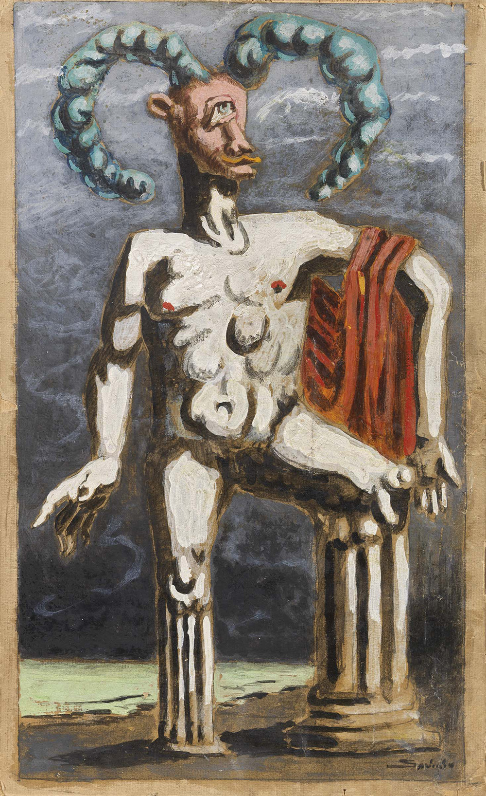 Alberto Savinio Atene 1891 - Roma 1952 Orgoglio, (1945) Tempera su carta applicata su tavola, cm. 40x24,5 Firma in basso a destra: Savinio; firma e titolo al verso: Alberto Savinio / "Orgoglio": etichetta e timbro Galleria Borromini, Milano: etichetta Comune di Ferrara - Palazzo dei Diamanti / Direzione Gallerie Civiche d'Arte Moderna / Mostra A. Savinio: due etichette Spazio Immagine Galleria d'Arte Contemporanea, Milano, di cui una con indicazione Alberto Savinio / dipinti e disegni 1927-1951 / 21 aprile - 15 giugno 1988. Storia Galleria Borromini, Milano; Galleria Spazio Immagine, Milano; Collezione privata Esposizioni Alberto Savinio. Opere recenti, Roma, Libreria La Margherita, dal 19 aprile 1945; Pitture di Savinio, Milano, Galleria Borromini, 19 aprile - 4 maggio 1947, cat. p. n.n.; Alberto Savinio, Ferrara, Galleria Civica d'Arte Moderna, Palazzo dei Diamanti, 5 luglio - 5 ottobre 1980, cat. n. 90, illustrata; Alberto Savinio dipinti e disegni 1921-1951, Milano, Galleria Spazio Immagine, 22 aprile - 15 giugno 1988, cat. pp. 50, 51, illustrata. Bibliografia Albanie Costes Monotti, Invitation au voyage, in Presence, Parigi, 3 giugno 1945; Vincenzo Costantini, Maschere di Savinio, in Sabato del Lombardo, Milano, 26 aprile 1947; Sarebbe un super-barman, in Corriere Lombardo, 26 - 27 aprile 1947; Alberto Savinio, Editoriale Periodici Italiani, Milano, 1949, p. n.n. (con titolo «Ambizione» e data 1947); Maurizio Fagiolo dell'Arco, Alberto Savinio, Fabbri Editore, Milano, 1989, pp. 216, 246, n. 123; Pia Vivarelli, Alberto Savinio. Catalogo generale, Electa, Milano, 1996, p. 177, n. 1945 8 (con supporto errato).