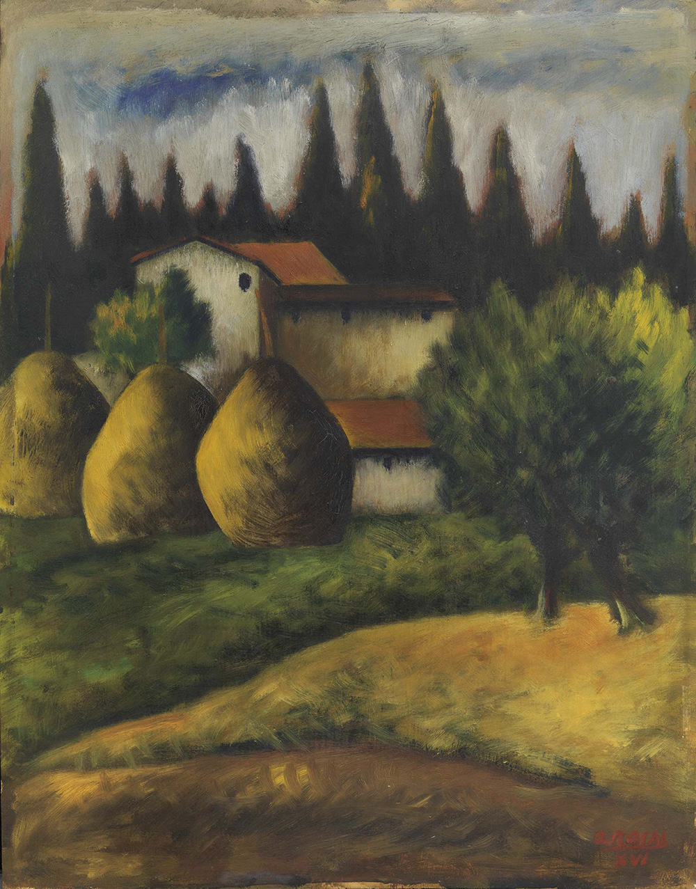 Ottone Rosai Firenze 1895 - Ivrea (To) 1957 Paesaggio con i covoni, 1938 Olio su tavola, cm. 54x42 Firma e data in basso a destra: O. Rosai / XVI. Storia Collezione privata, Firenze; Collezione privata Certificato su foto di Luigi Cavallo, Milano, 24 aprile 2018.