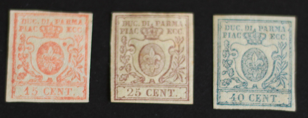 Parma 1857/59-numeri 9,10,11, linguellati, numero 10 firma A. Diena e E. Diena, num. 11 firma A.Diena+Biondi Prezzo di catalogo : 2.350 €