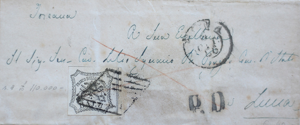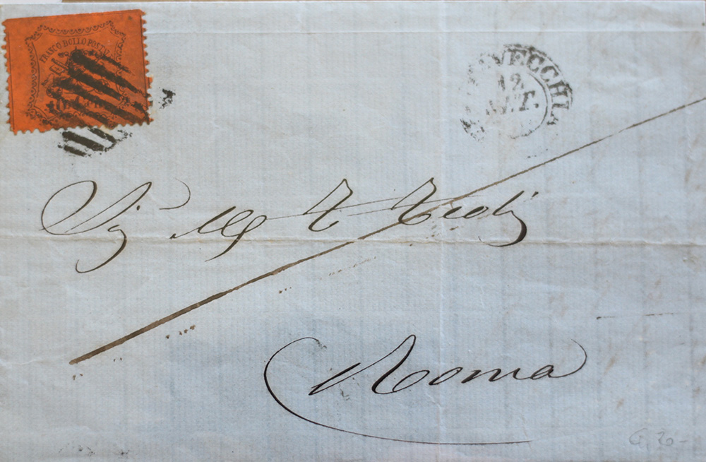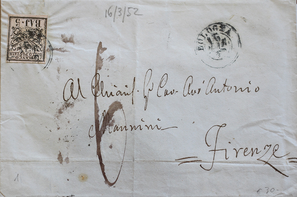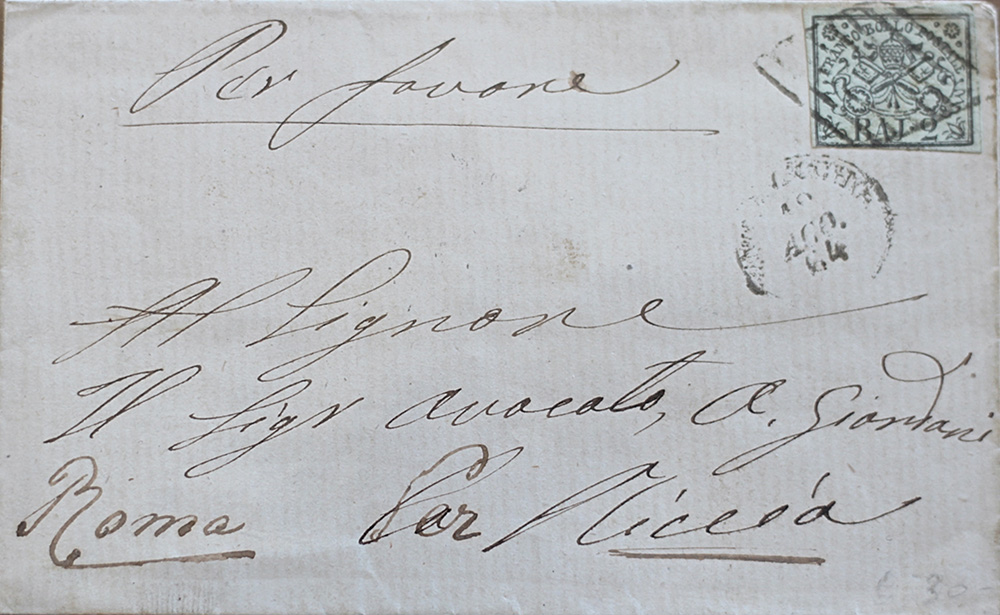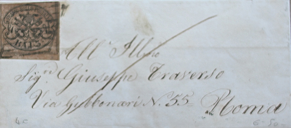 Stato Pontificio 1852-lotto di 6 francobolli su 6 buste, num. 2,3,4,6,9,26 Prezzo di catalogo : 735 €