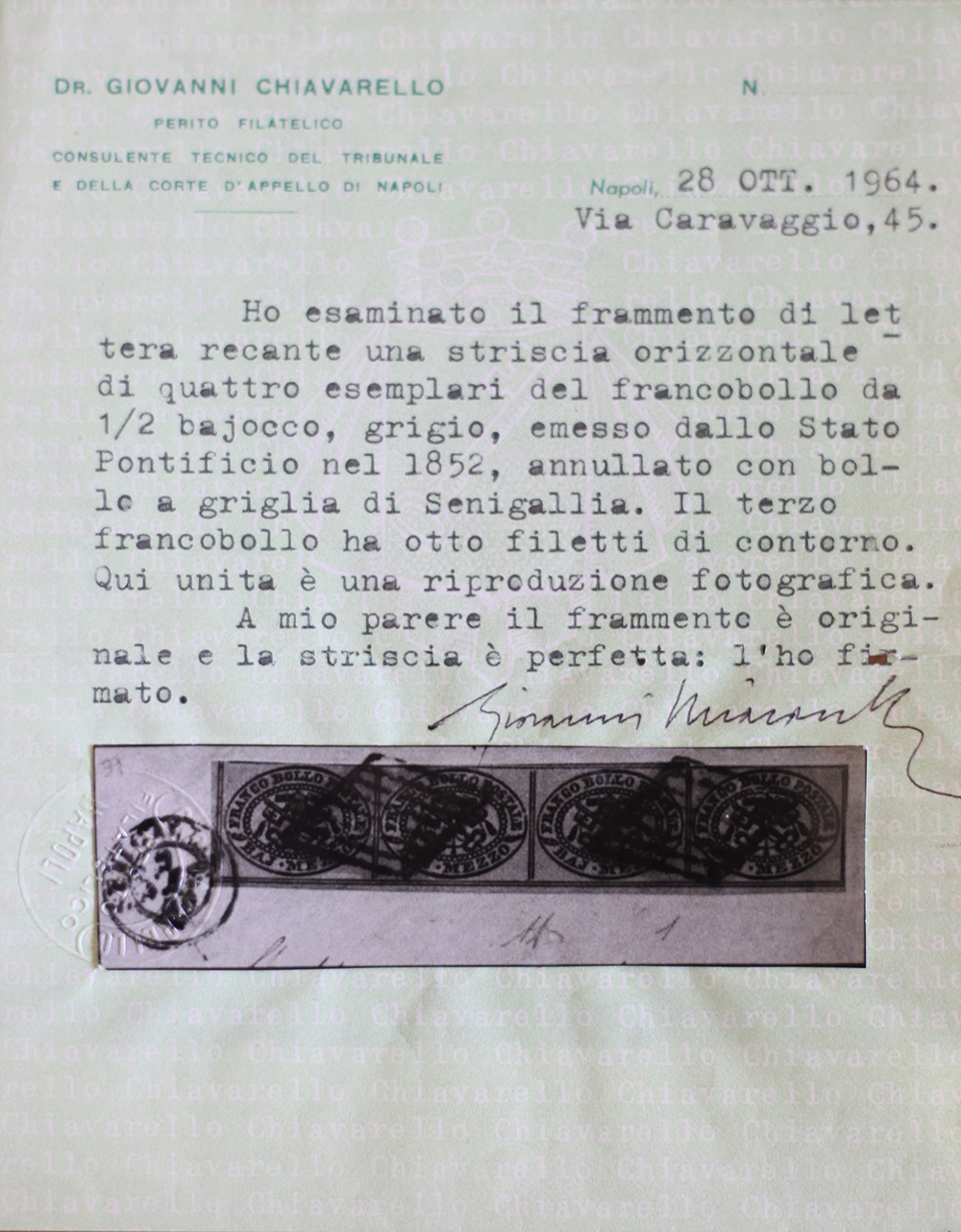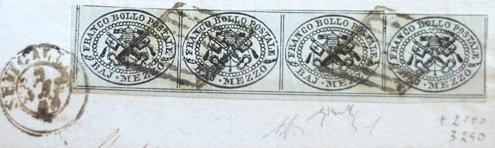 Stato Pontificio 1852- num.1 striscia di 4 su frammento di cui uno con 8 filetti, certificato Chiavarello Prezzo di catalogo : /