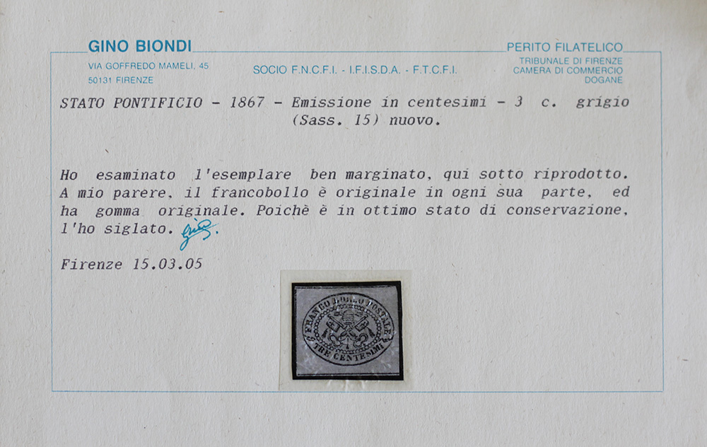 Stato Pontificio 1867-num. 15 linguellato, piccole pieghette, certificato Biondi Prezzo di catalogo : 2.750 €