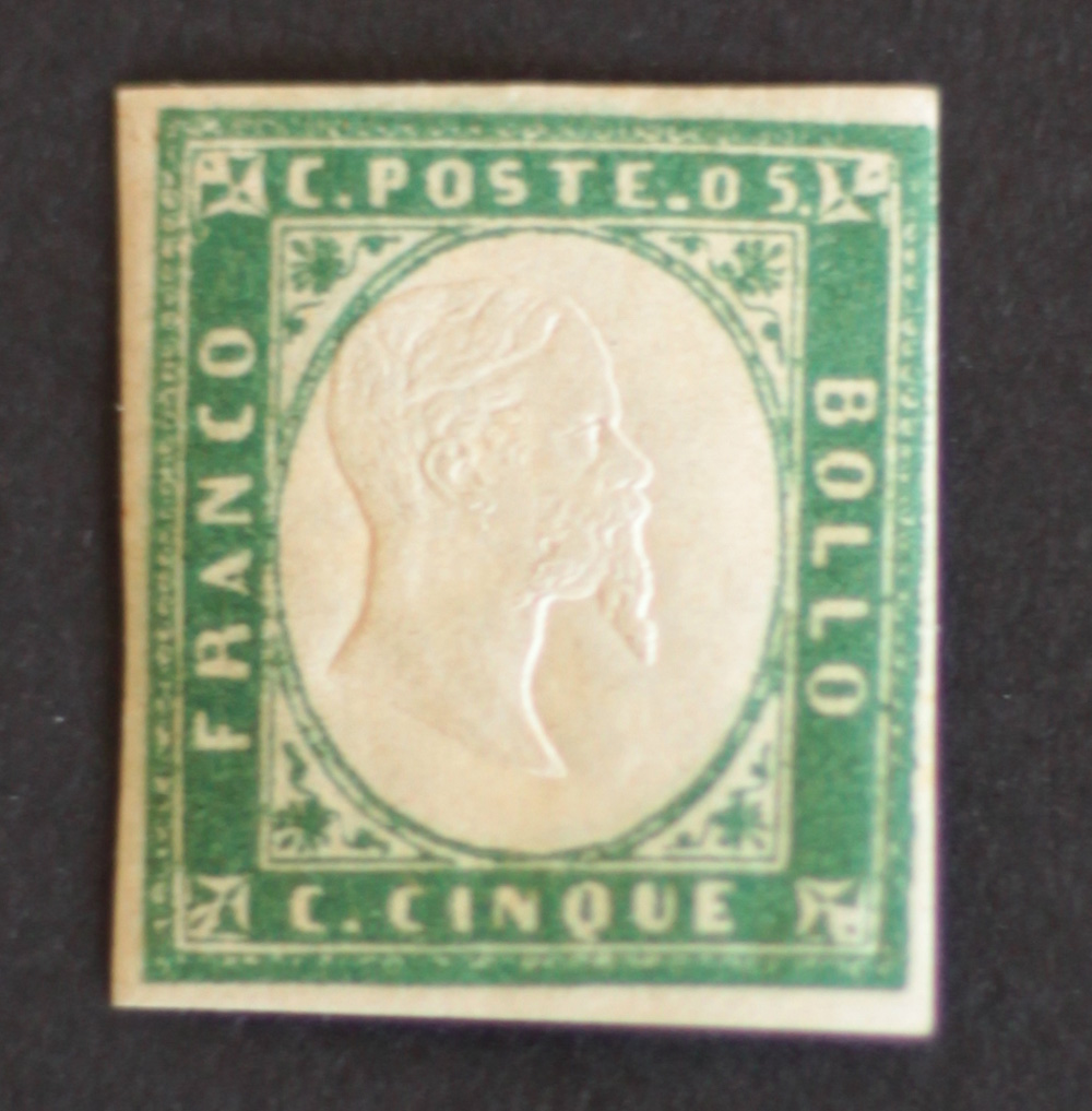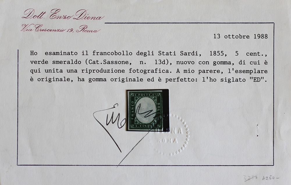 Lot 89 | Sardegna 1855/63-num. 13d colore verde smeraldo, linguellato, certificato E....
