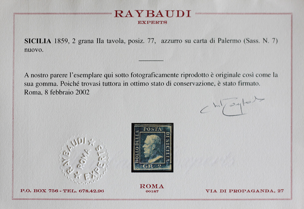 Sicilia 1859-num.7 linguellato, certificato Ray Baudi Prezzo di catalogo :...