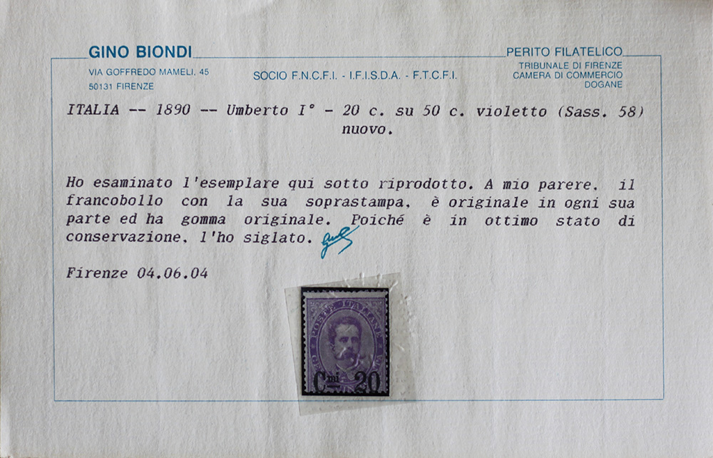 1890/91 num.58 linguellato, certificato Biondi Prezzo di catalogo : 300 €