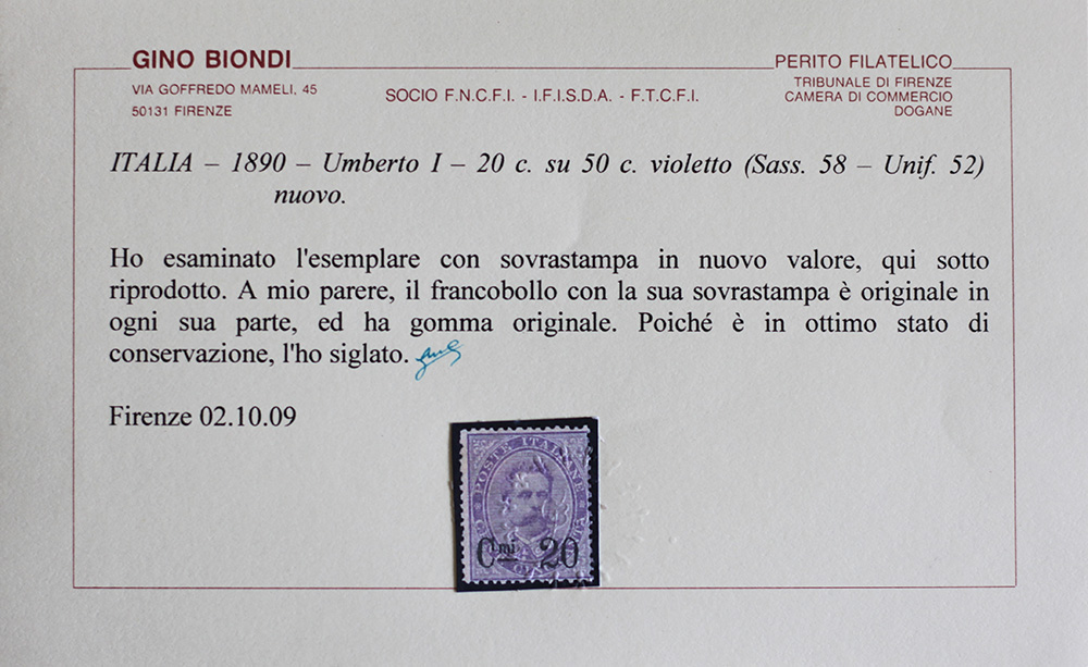 Lot 165 | 1890/91 num.58 linguellato, certificato Biondi Prezzo di catalogo : 300 €