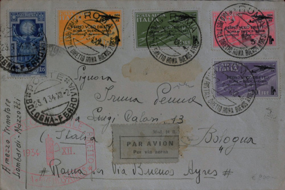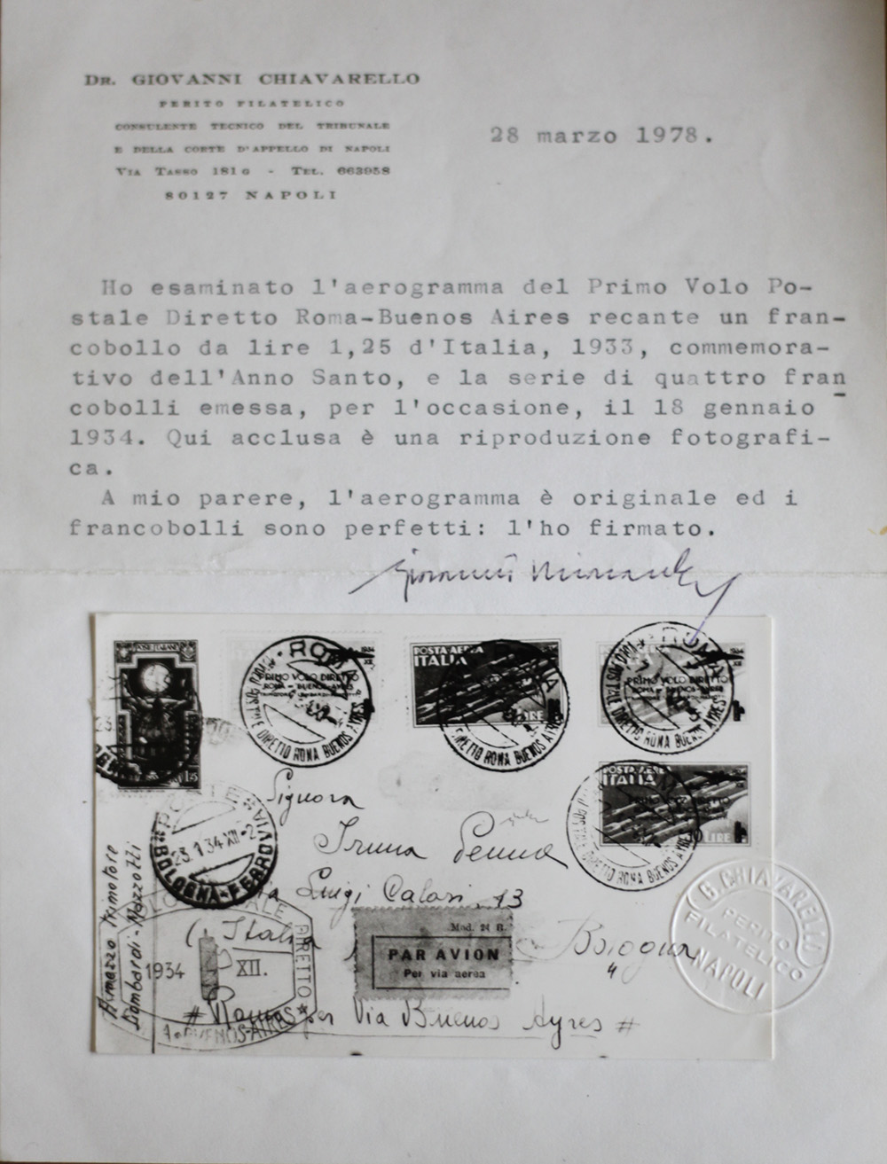 1934 aerea 56-59, + num. 348 su busta con annulli del volo Roma-Buenos Aires, certificato Chiavarello Prezzo di catalogo : 2.250 €