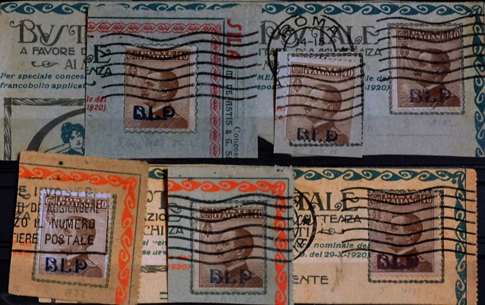 1921 num.4 in 6 esemplari con sovrastampe di colori diversi usati su frammenti Prezzo di catalogo : 300 € ++