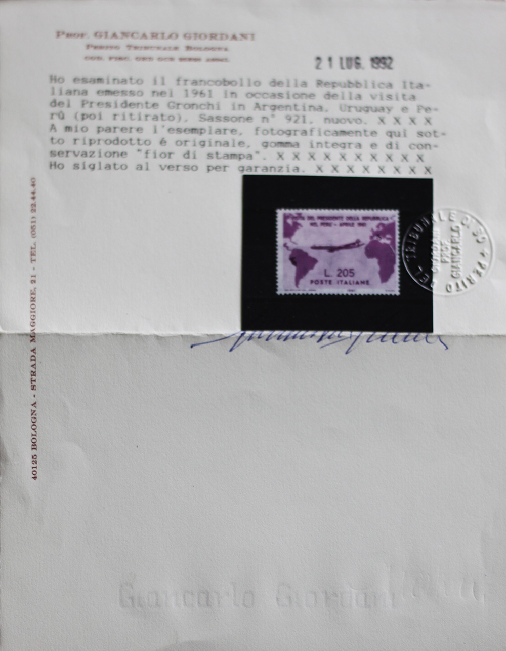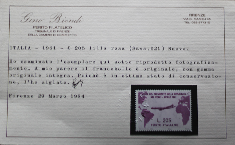 1961 num.921 senza linguella, certificato Biondi+Giordani Prezzo di catalogo...