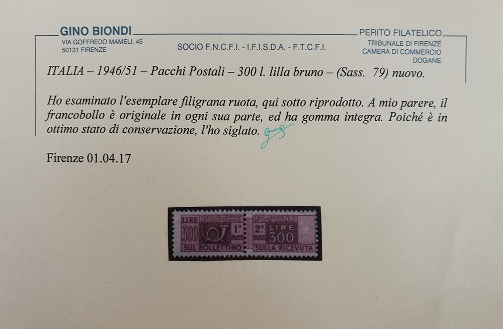 1946/51 pacchi postali num.79 senza linguella, certificato Biondi Prezzo di catalogo : 1.500 €
