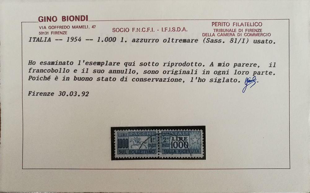 1954 pacchi postali 81/I usato, certificato Biondi Prezzo di catalogo : 4.000 €