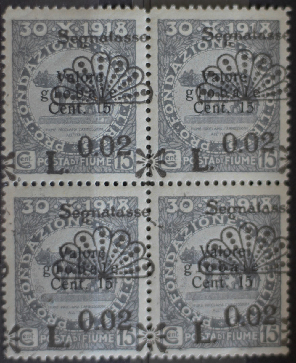 1921 Fiume segnatasse num.15 in quartina senza linguella Prezzo di catalogo : 1.000 €