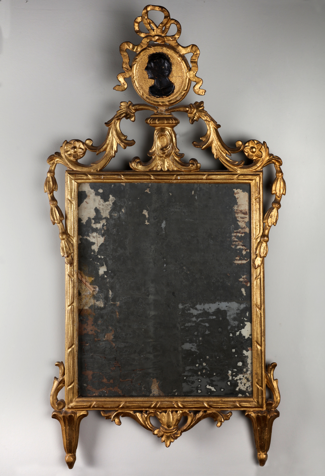MANIFATTURA ITALIANA DEL XIX SECOLO Specchiera in legno dorato decorata a festoni, cimasa a medaglione con profilo d'uomo in legno ebanizzato. . Cm 60,00 x 108,00 x 10,00.