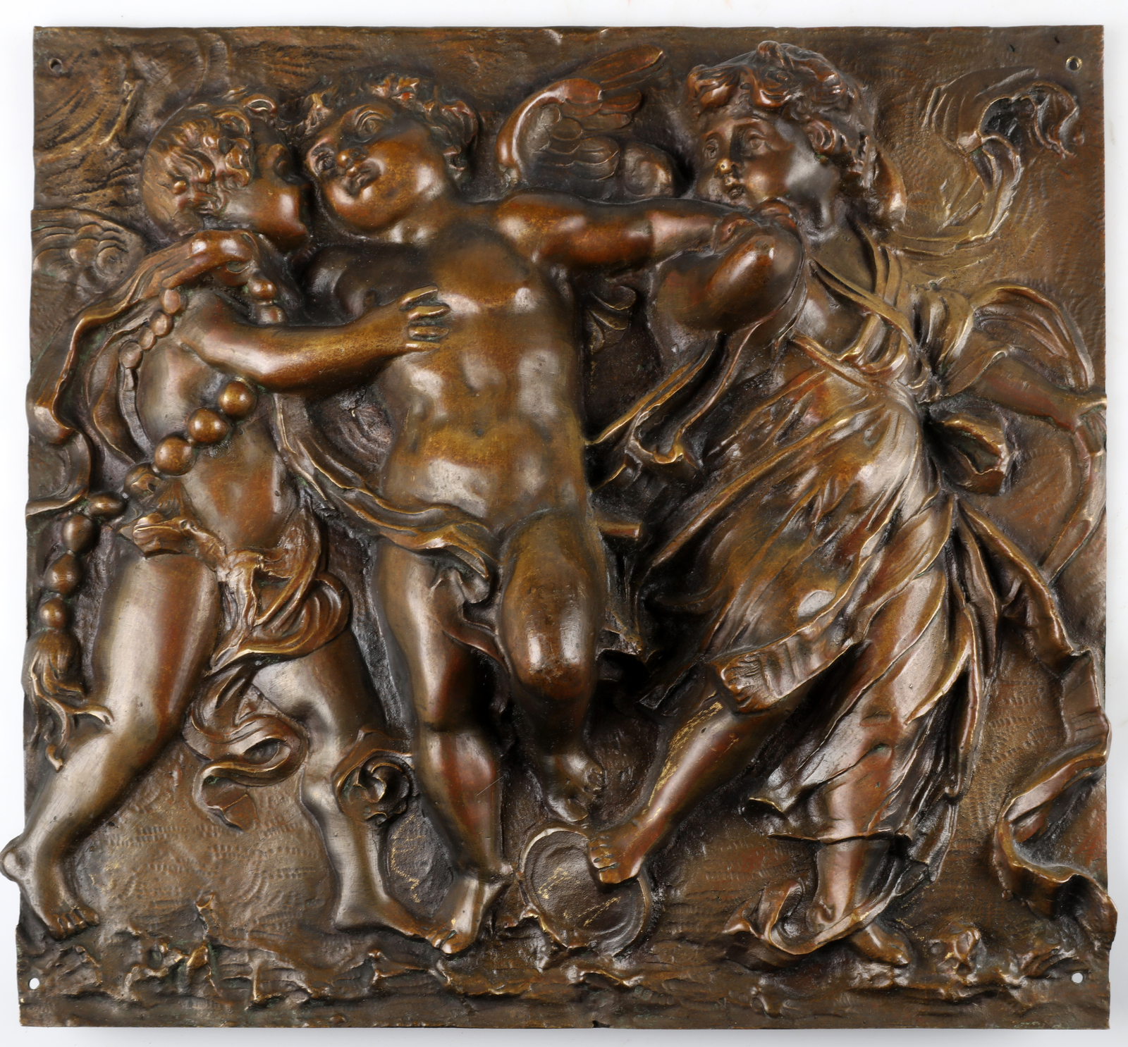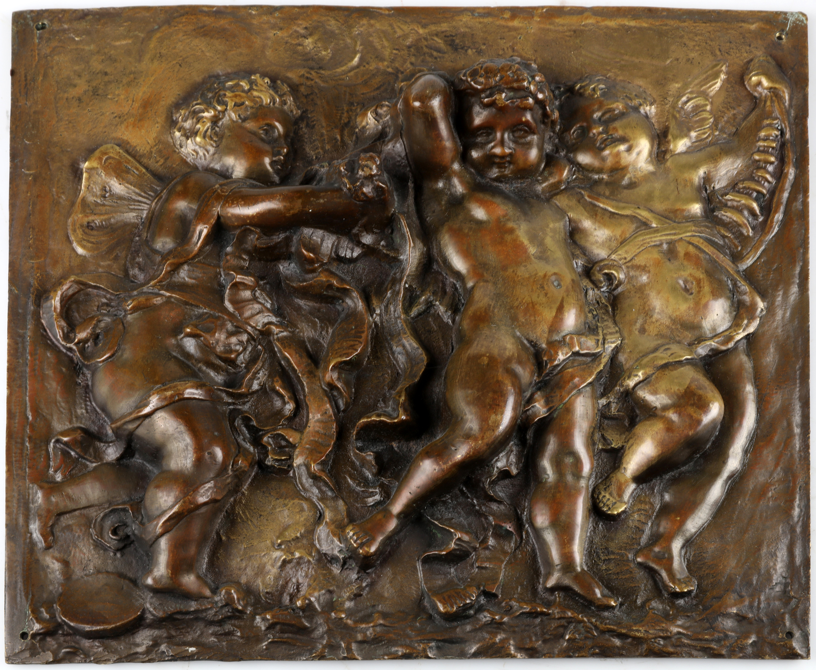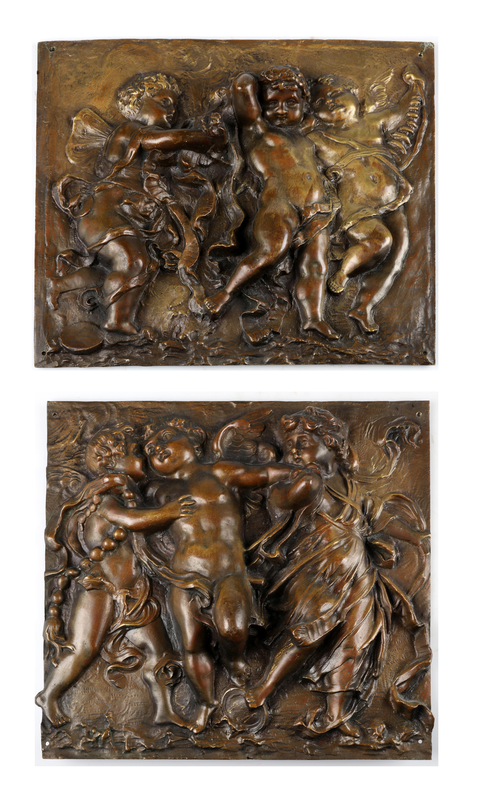 SCULTORE DEL XIX SECOLO Coppia di formelle decorative in bronzo raffiguranti putti danzanti. . Cm 32,50 x 32,00.