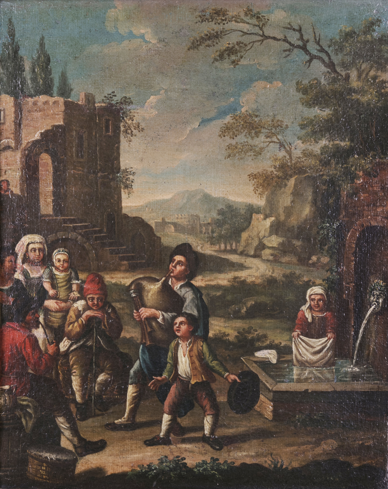 PITTORE BAMBOCCIANTE Personaggi presso una fontana. Olio su tela . Cm 37,00 x 46,00. . Cornice presente