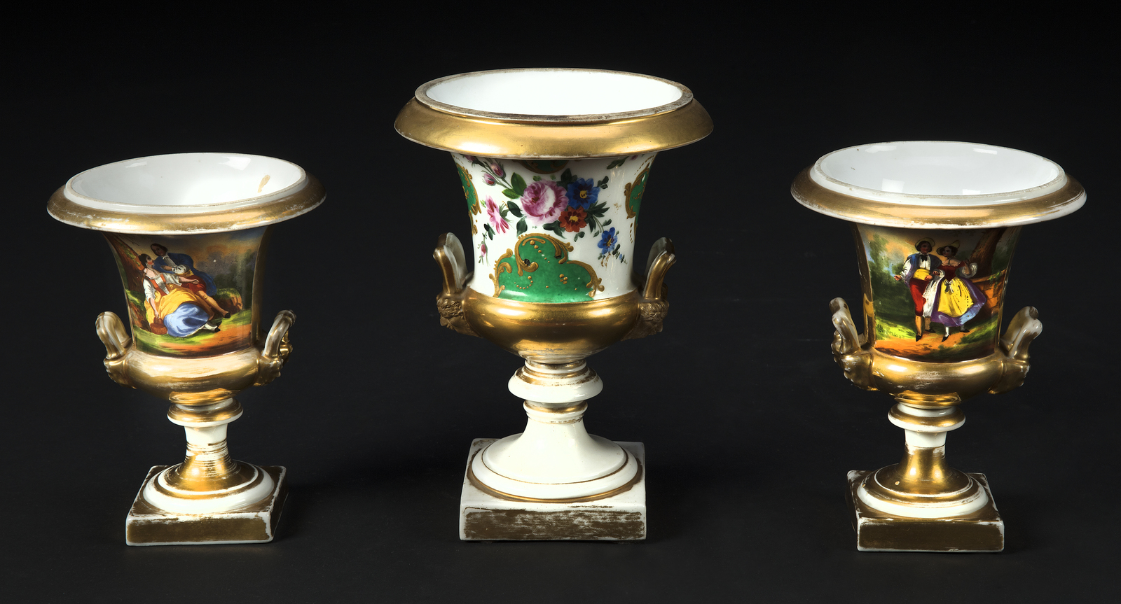 MANIFATTURA FRANCESE DEL XIX SECOLO Tre vasi Parigi di misure diverse, Francia, XIX secolo, altezze rispettive di cm 23,00; la coppia cm 19,00. . .