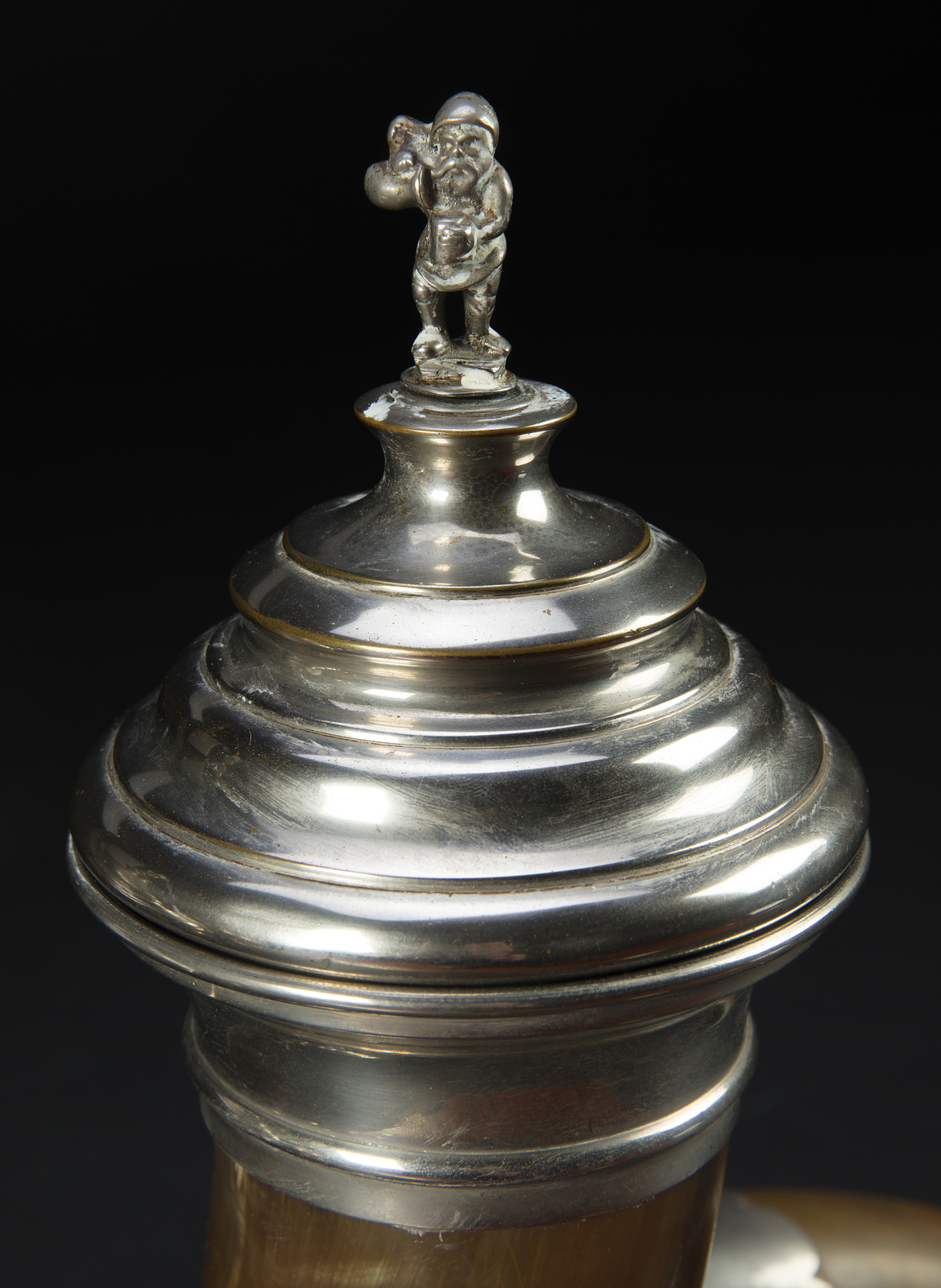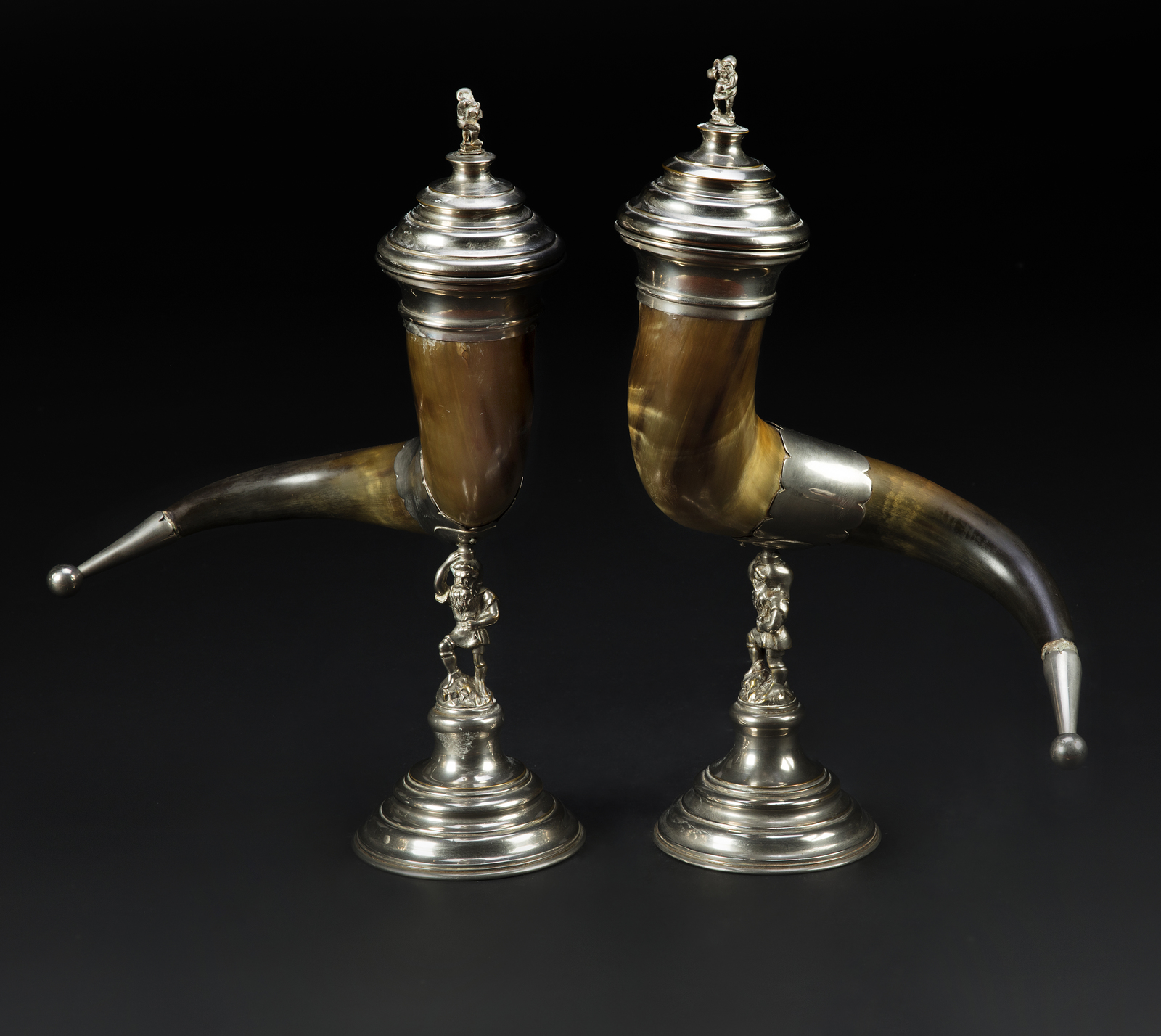MANIFATTURA NORD EUROPEA DEL XIX SECOLO Coppia di corni di bufalo montati con elementi in argento. . Cm 45,00.