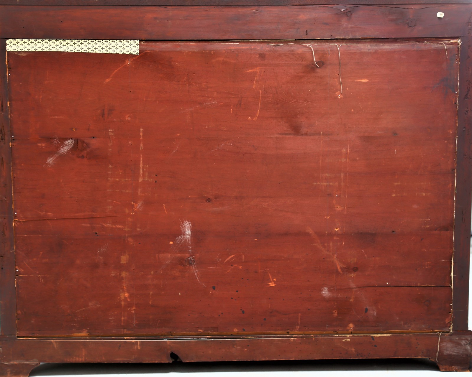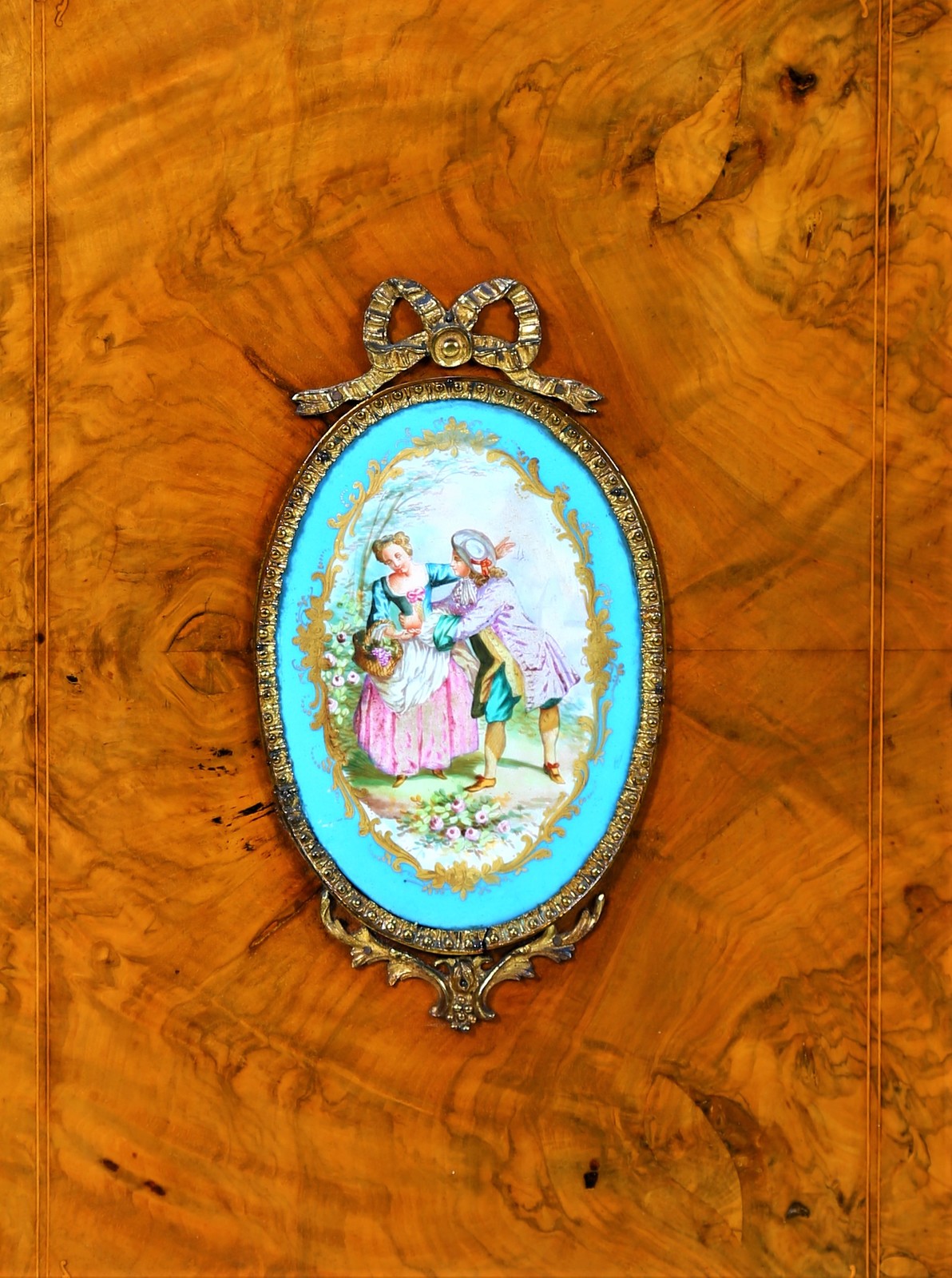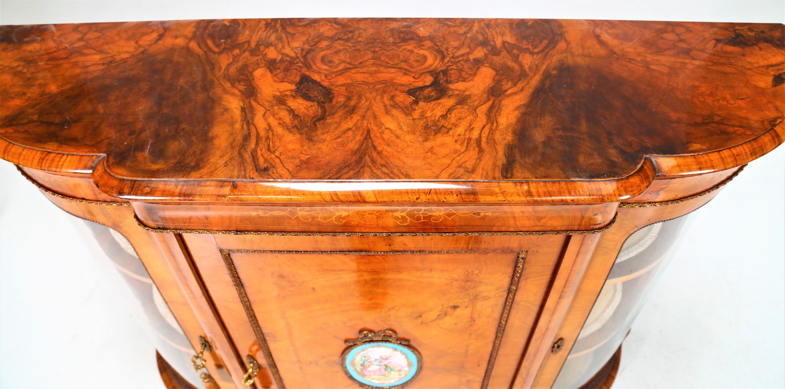 MANIFATTURA INGLESE DEL XIX SECOLO Credenza in radica di tuja, a tre ante, piano sagomato, medaglione centrale in porcellana inserita in una fascia in bronzo dorato. . . Cm 138,00 x 104,00 x 37,00.