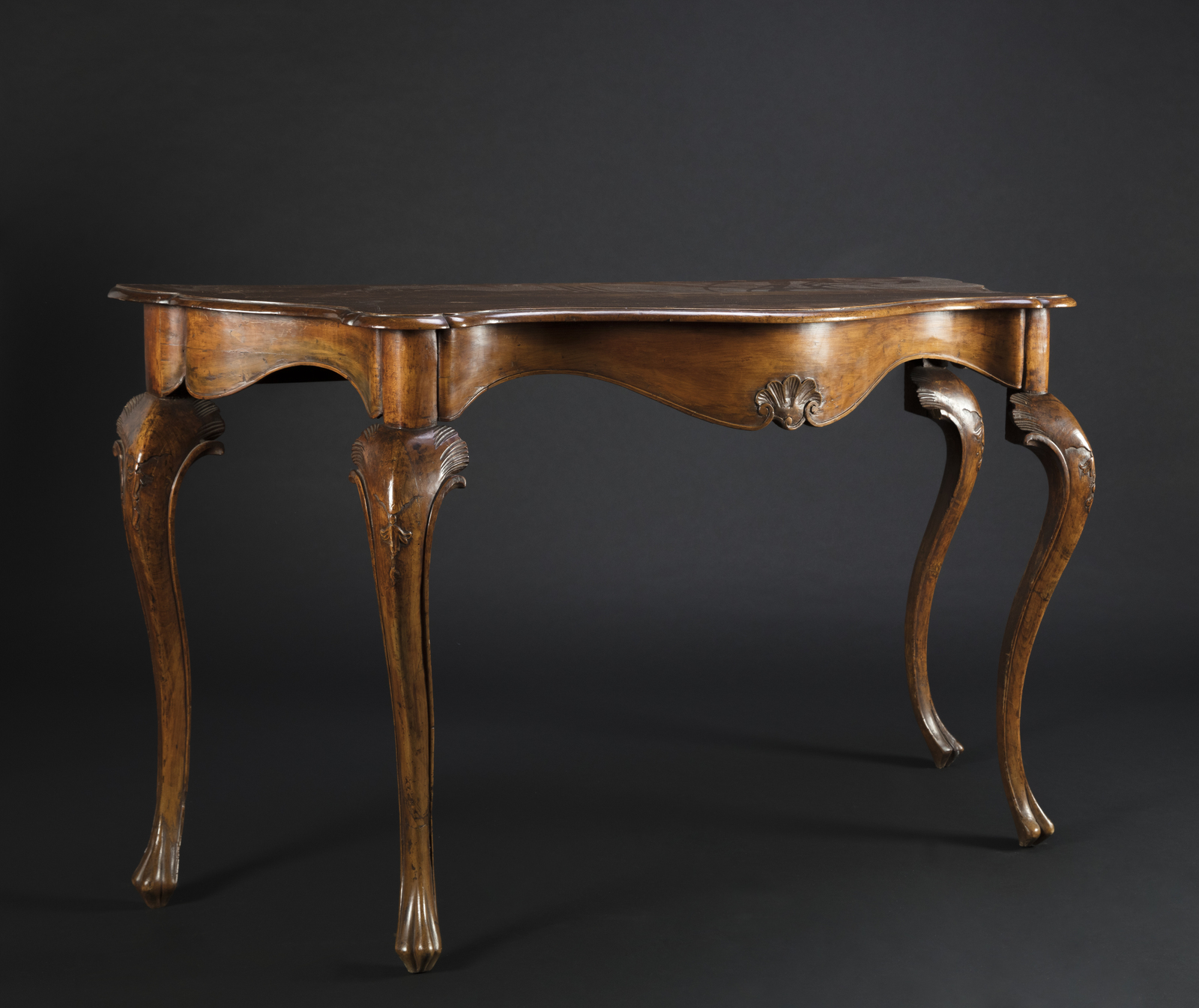 MANIFATTURA VENETA DEL XVIII SECOLO Console Luigi XV in legno di noce, piano sagomato, gambe arcuate. . Cm 140,00 x 82,00 x 64,00.