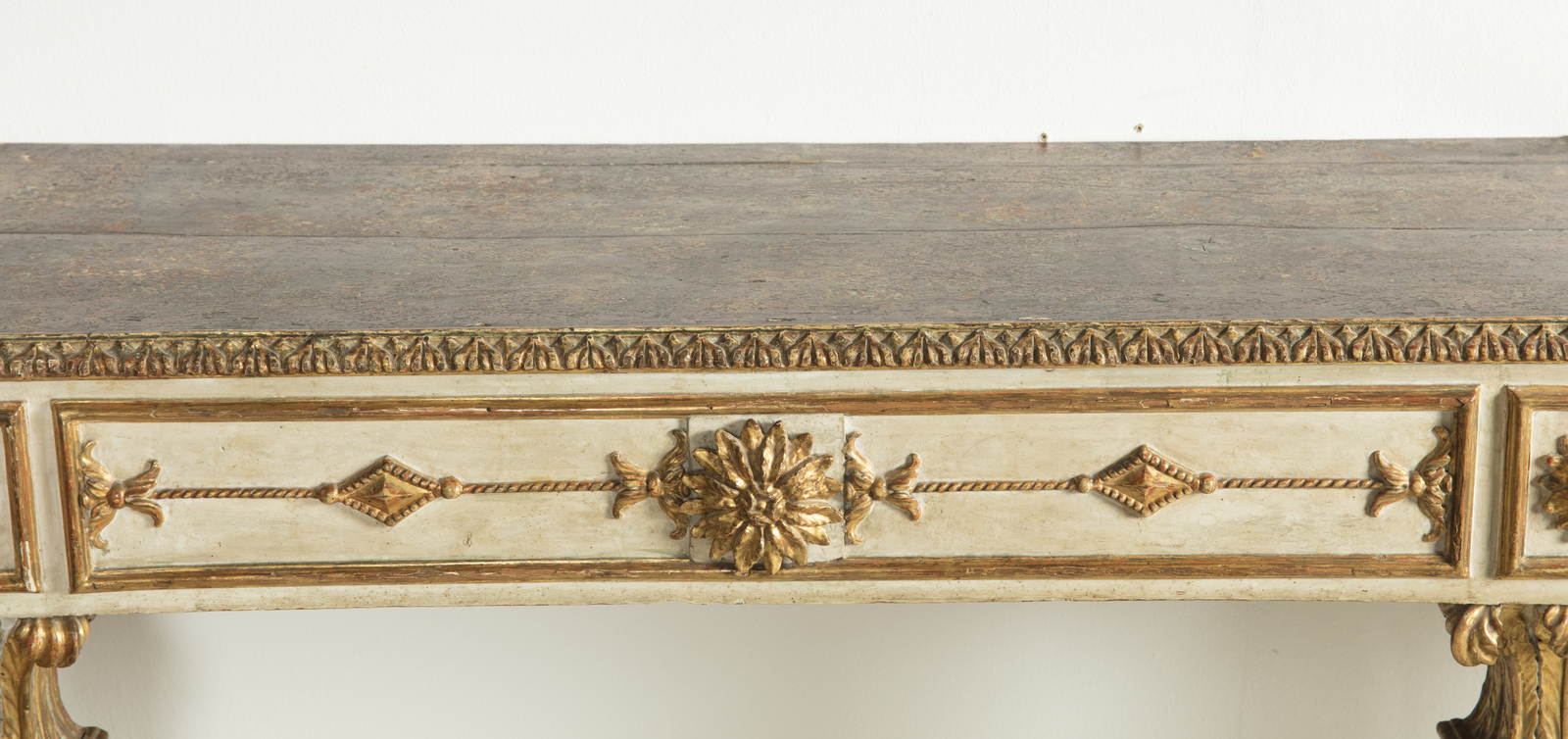 MANIFATTURA DEGLI INIZI DEL XIX SECOLO Coppia di consolles in legno laccato, gambe a piramide rovesciata, fascia decorata con fregi in legno dorato. . Cm 100,00 x 97,00 x 35,00. Difetti.