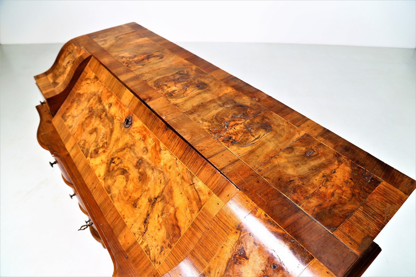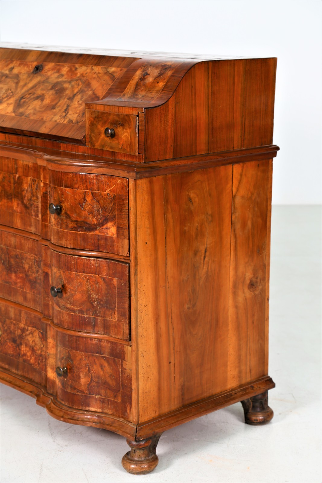 MANIFATTURA VENETA DEL XVIII SECOLO Ribalta in legno e radica di noce a tre cassetti più due, mossa sul fronte. . Cm 106,00 x 128,00 x 55,00.