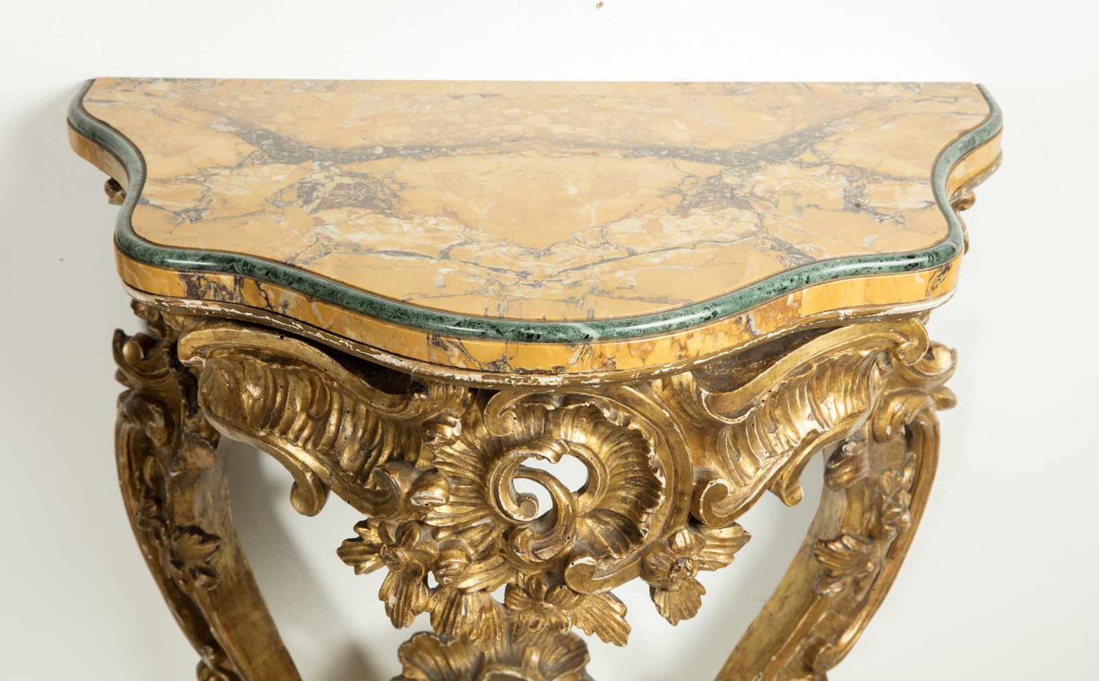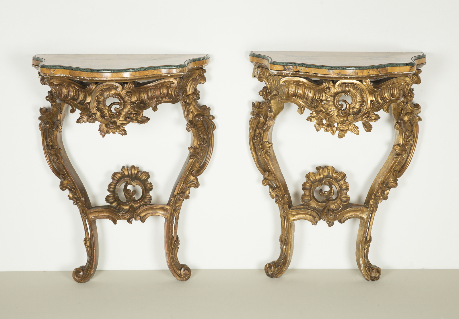 MANIFATTURA DEL XVIII SECOLO Coppia di Consolles intagliate e dorate a motivi rocaille, piano lastronato in marmo. . Cm 64,00 x 86,00 x 40,00. Difetti.