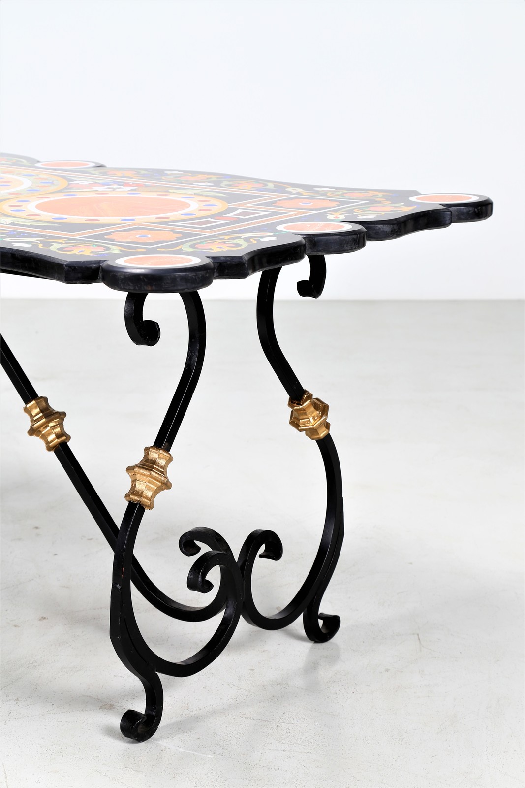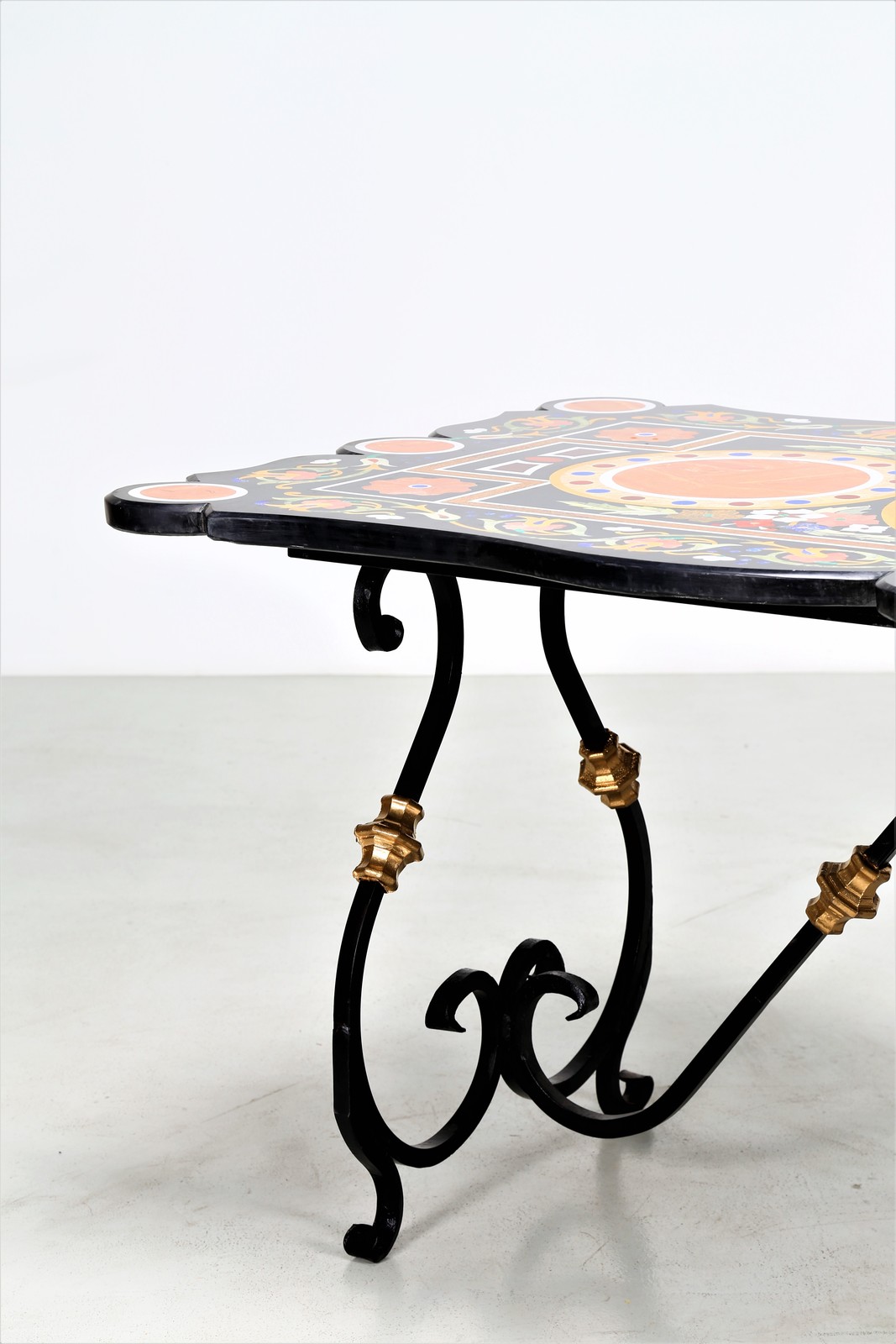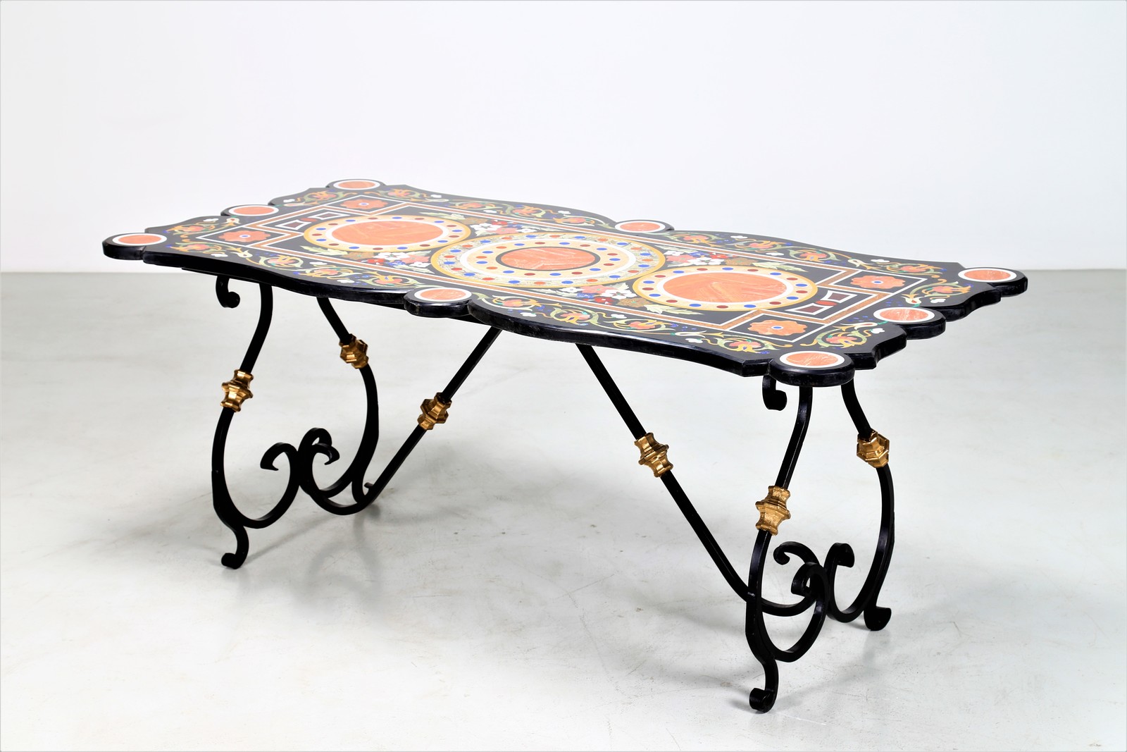 MANIFATTURA ITALIANA DEL XX SECOLO Piano sagomato in marmi diversi con decorazioni a motivi fogliacei. . Cm 183,00 x 77,00 x 90,00.