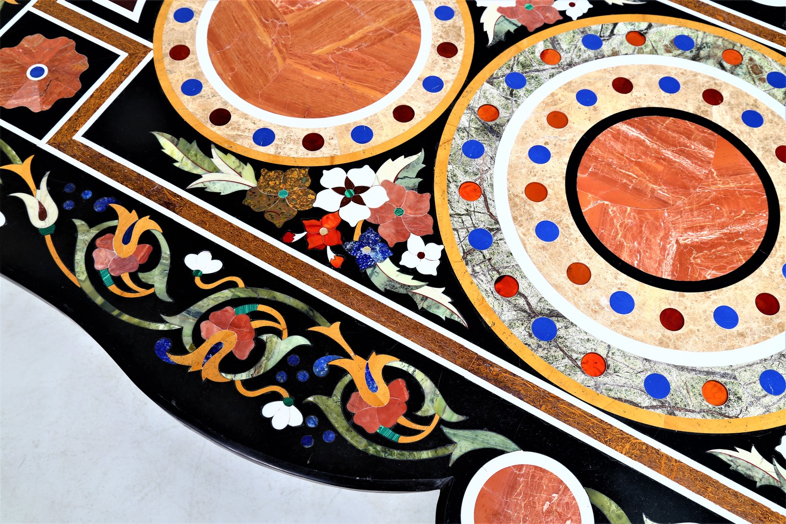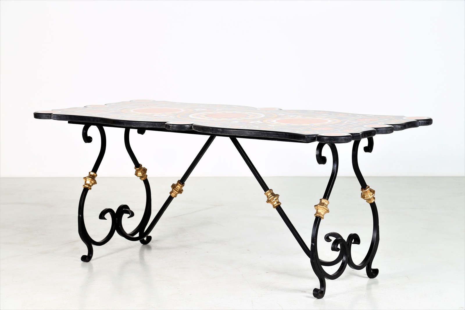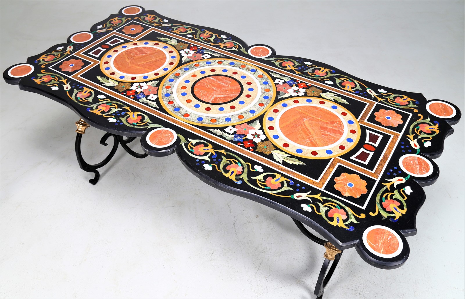 MANIFATTURA ITALIANA DEL XX SECOLO Piano sagomato in marmi diversi con decorazioni a motivi fogliacei. . Cm 183,00 x 77,00 x 90,00.