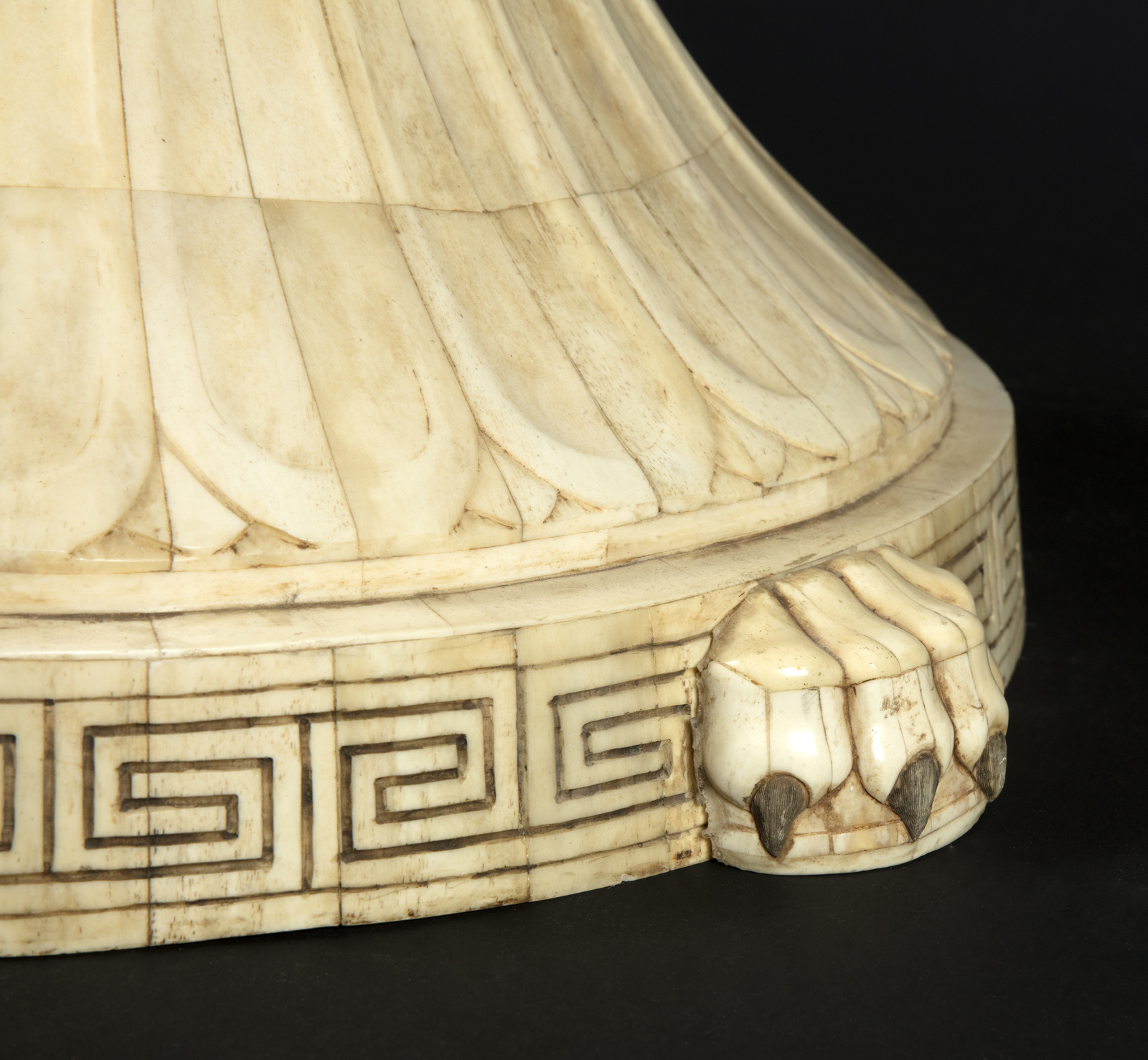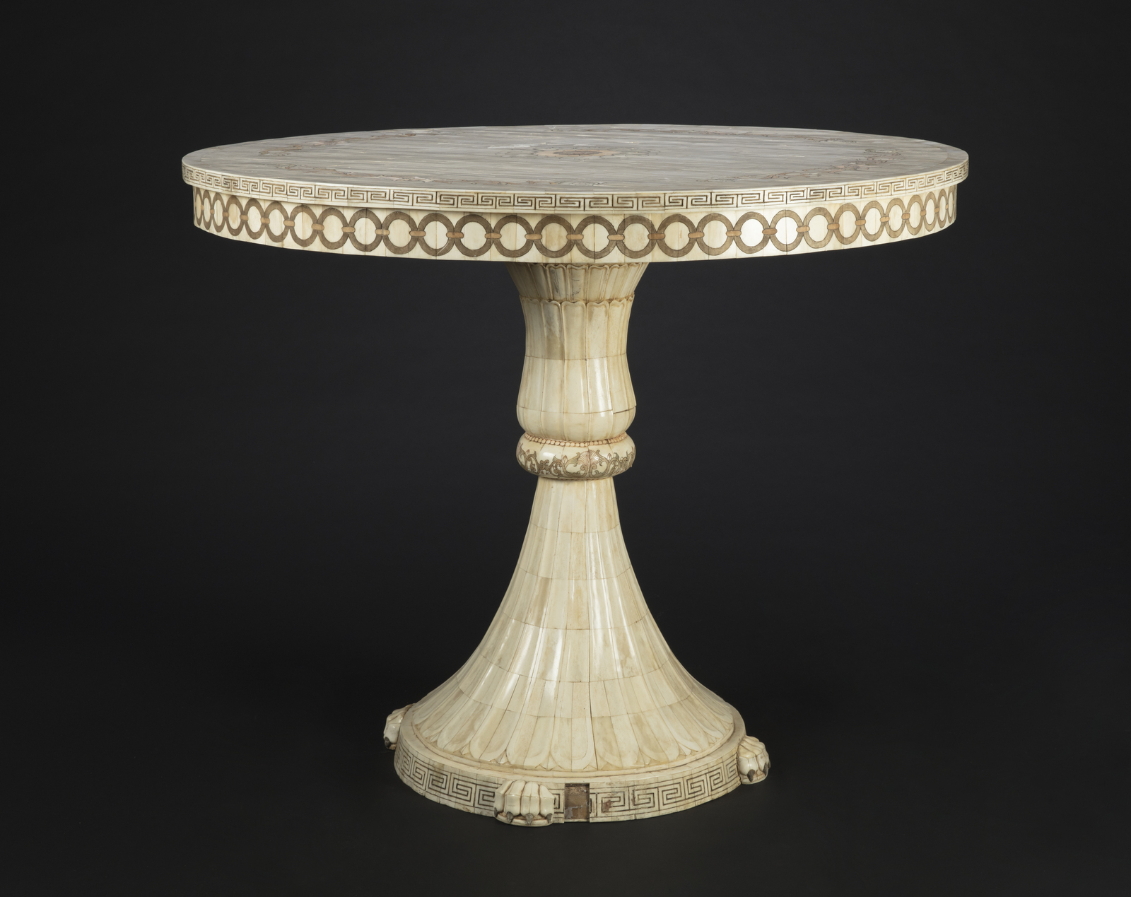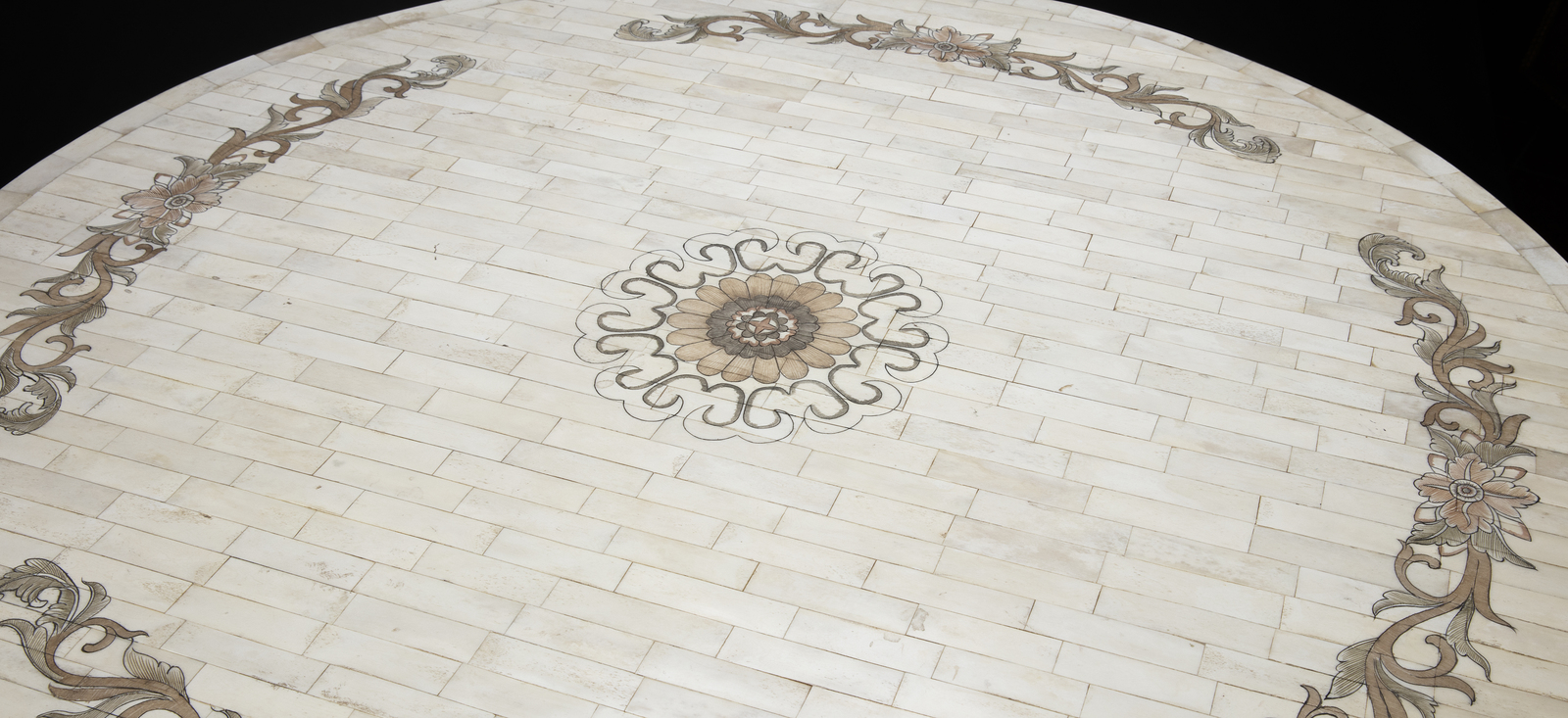 MANIFATTURA DEL XIX SECOLO Tavolo circolare con corpo in legno lastronato in osso di stile Impero, piano e fascia cesellati e dipinti a motivi fogliacei e geometrici, base circolare intervallata da decorazioni intagliate a forma di gambe leonine. . Cm 107,00 x 88,00. Difetti e mancanze.