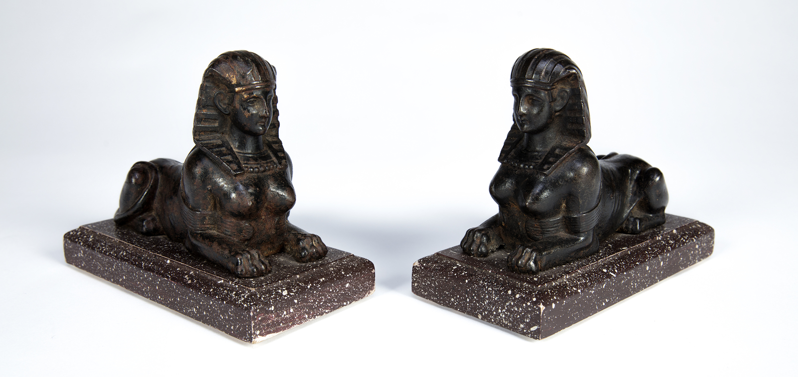 MANIFATTURA FRANCESE DEL XIX SECOLO Coppia di Sfingi in bronzo brunito, Francia, XIX, su basi in porfido. . Cm 20,00 x 13,50 x 5,50.