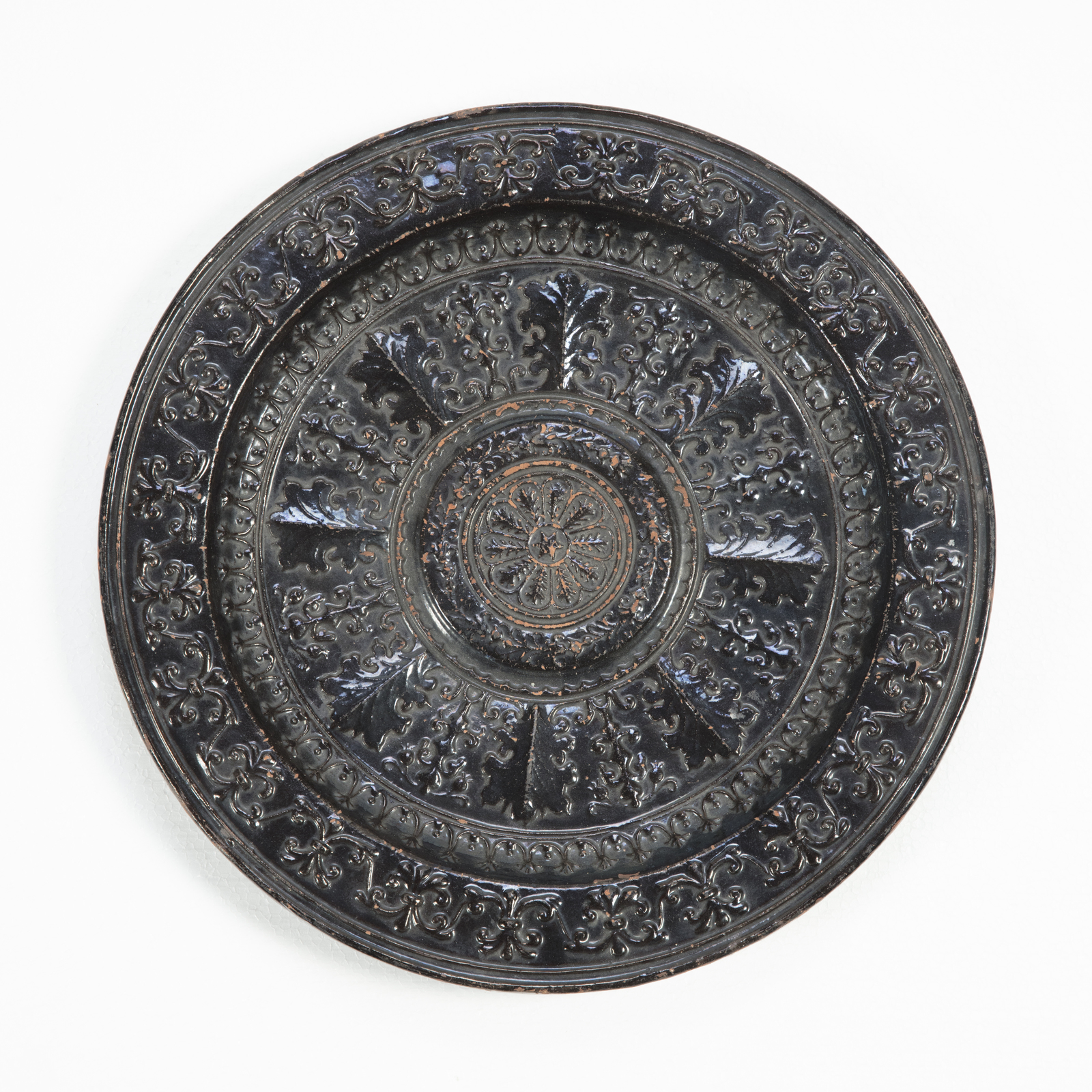 MANIFATTURA PORTOGHESE DEL XVII SECOLO Piatto elemosiniere in terracotta dipinta. Terracotta dipinta. Cm 40,50.